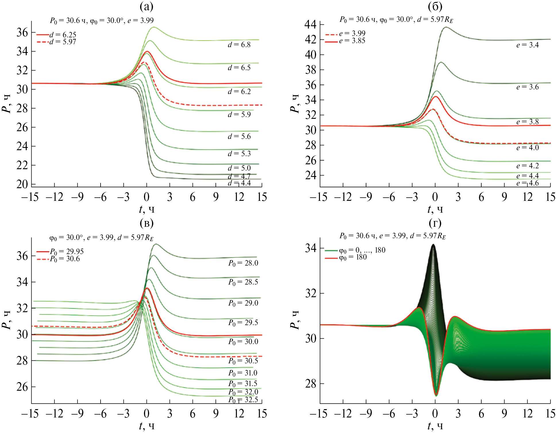 Рис. 3. Изменение периода вращения астероида при его сближении с Землей для разных значений параметров: (а) – d; (б) – e; (в) – P0; (г) – φ0. Жирная красная кривая соответствует примерному значению варьируемого параметра (d, e или P0), при котором ∆P = 0. Пунктирная красная кривая соответствует значению варьируемого параметра (d, e или P0) для Апофиса (Pravec и др., 2014). Момент времени t = 0 соответствует прохождению астероидом точки сближения. В каждом случае показаны выборочные кривые изменения периода вращения астероида. На рисунке (г) параметр φ0 изменялся в интервале от 0° до 180° с шагом 1°; нанесены все кривые, градиент зеленого цвета от темного к светлому соответствует росту варьируемого параметра.