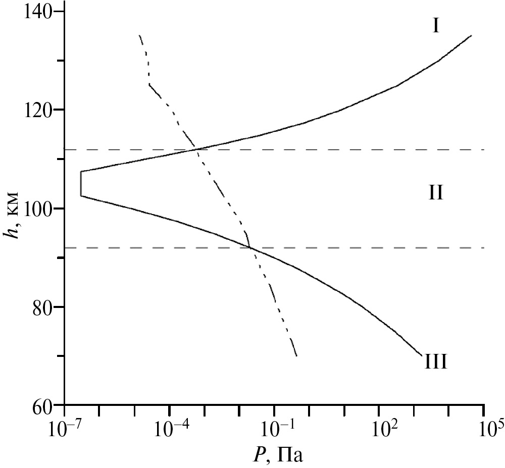 Рис. 1. Разделение атмосферы Марса на зоны: седиментации с постоянной массой (I), конденсации (II) и сублимации (III). Сплошная линия – давление насыщенных паров углекислого газа, штрихпунктирная – фактическое давление паров углекислого газа.