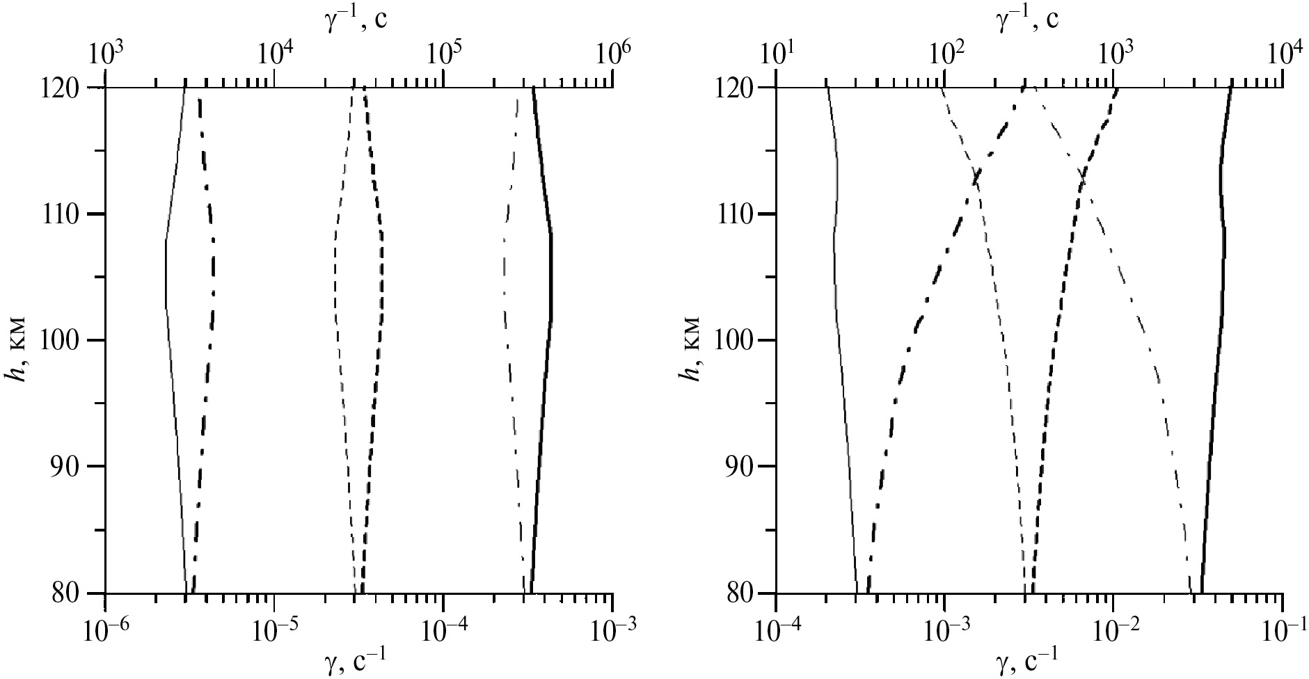 Как показывает численный анализ дисперсионного уравнения (11), инкремент неустойчивости достигает при некоторых значениях максимума γ. На рис. 2 приведены высотные профили для максимального инкремента и для величины γ–1, определяющей характерное время развития неустойчивости, при разных значениях концентраций и размеров пылевых частиц. Видно, что инкремент γ растет вместе с ростом пылевых параметров и, таким образом, должен ограничивать сверху максимальный размер микрочастицы пылевого облака.