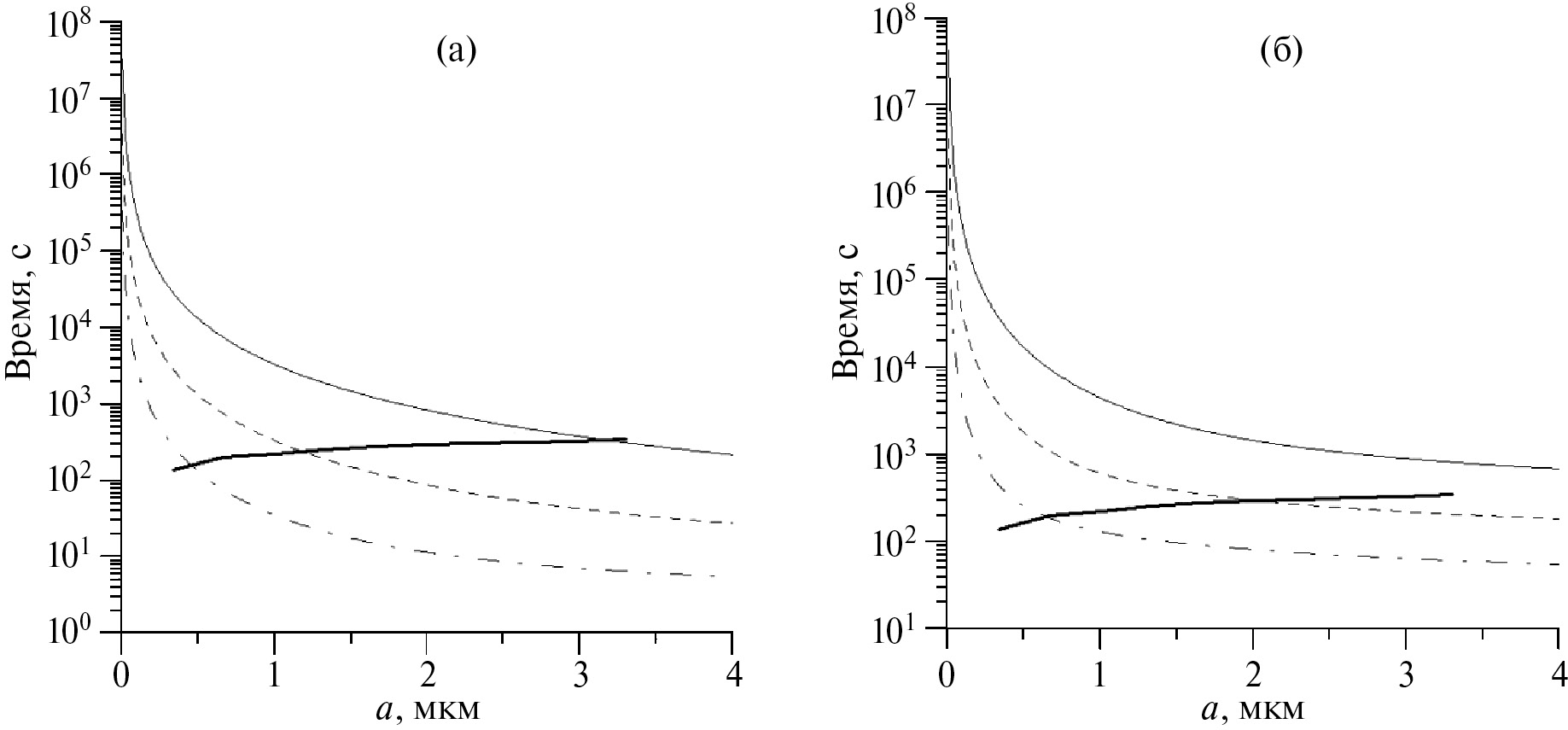 Рис. 3. Зависимость характерного времени развития неустойчивости Рэлея–Тейлора (тонкие линии) в сравнении с характерным временем седиментации (жирные линии) для высот: (а) – 80 км; (б) – 110 км. Сплошные линии соответствуют nd = 1 см–3, штриховые – nd = 10 см–3, штрихпунктирные – nd = 100 см–3.