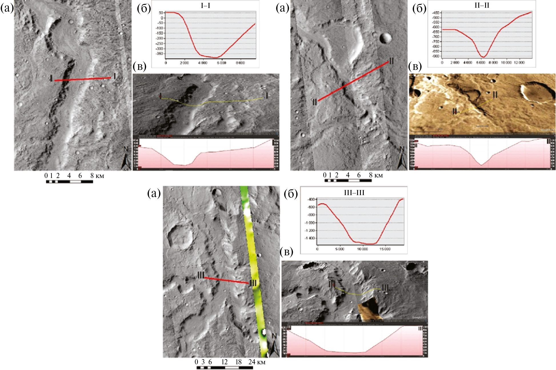 Рис. 6. Поперечные профили I–I–$5II–III главной долины системы долин Дуриус: (а) – на основе снимков CTX; (б) – ЦМР MOLA; (в) – на основе ЦМР HRSC, полученных на КА Mars Express.