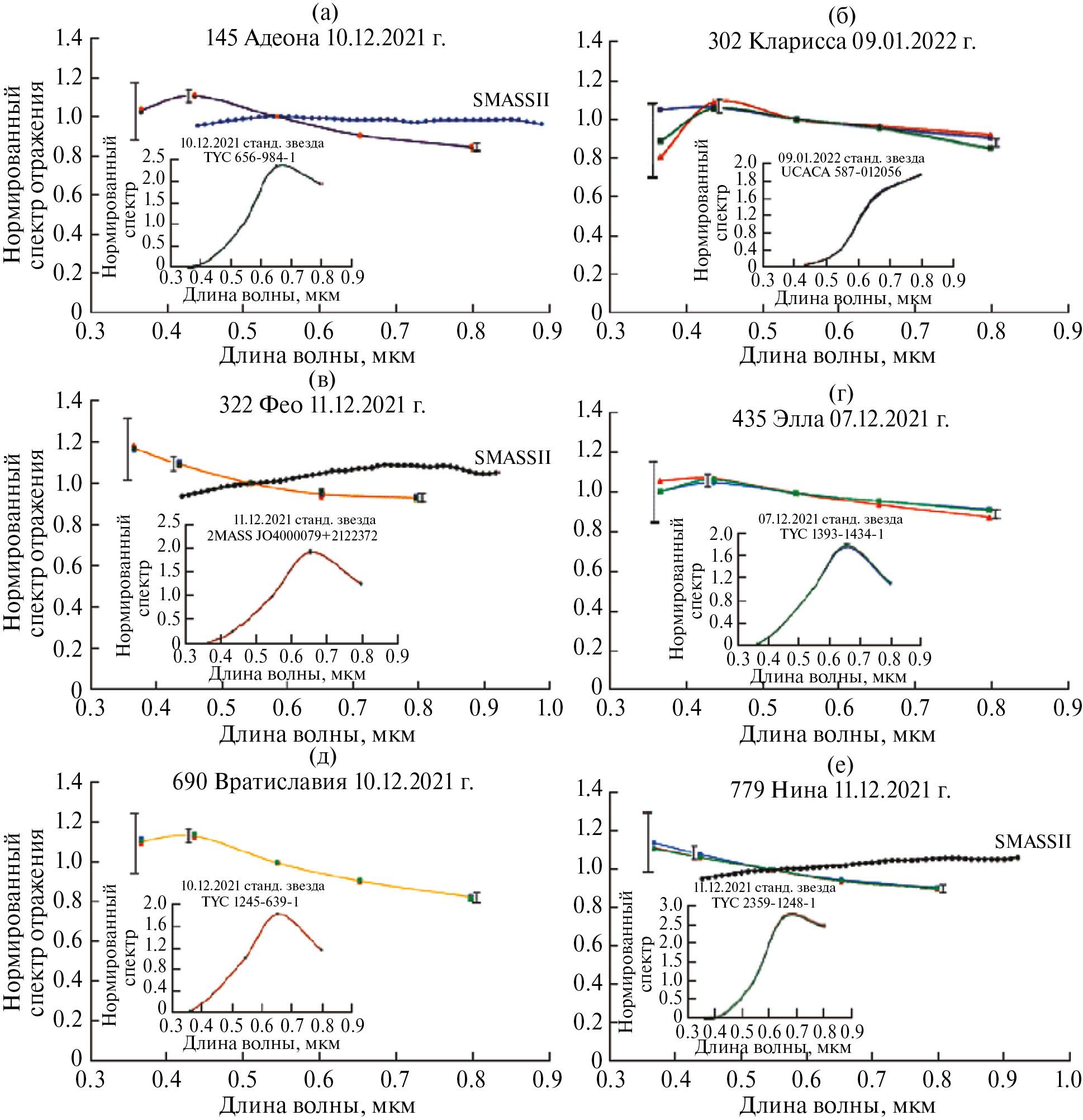 Рис. 2. Нормированные (на длине волны 0.55 мкм) аппроксимированные спектры отражения астероидов: (а) – 145 Адеона; (б) – 302 Кларисса; (в) – 322 Фео; (г) – 435 Элла; (д) – 690 Вратиславия; (е) – 779 Нина (Бусарев и др., 2023). Три последовательных спектра отражения каждого астероида изображены разными цветами. Для контроля стабильности фотометрических наблюдательных условий на вставках на каждом графике также показаны по три нормированных на длине волны 0.55 мкм последовательных спектра (практически совпадающих по причине хороших наблюдательных условий) контрольных непеременных звезд с общих с астероидами ПЗС-кадров.