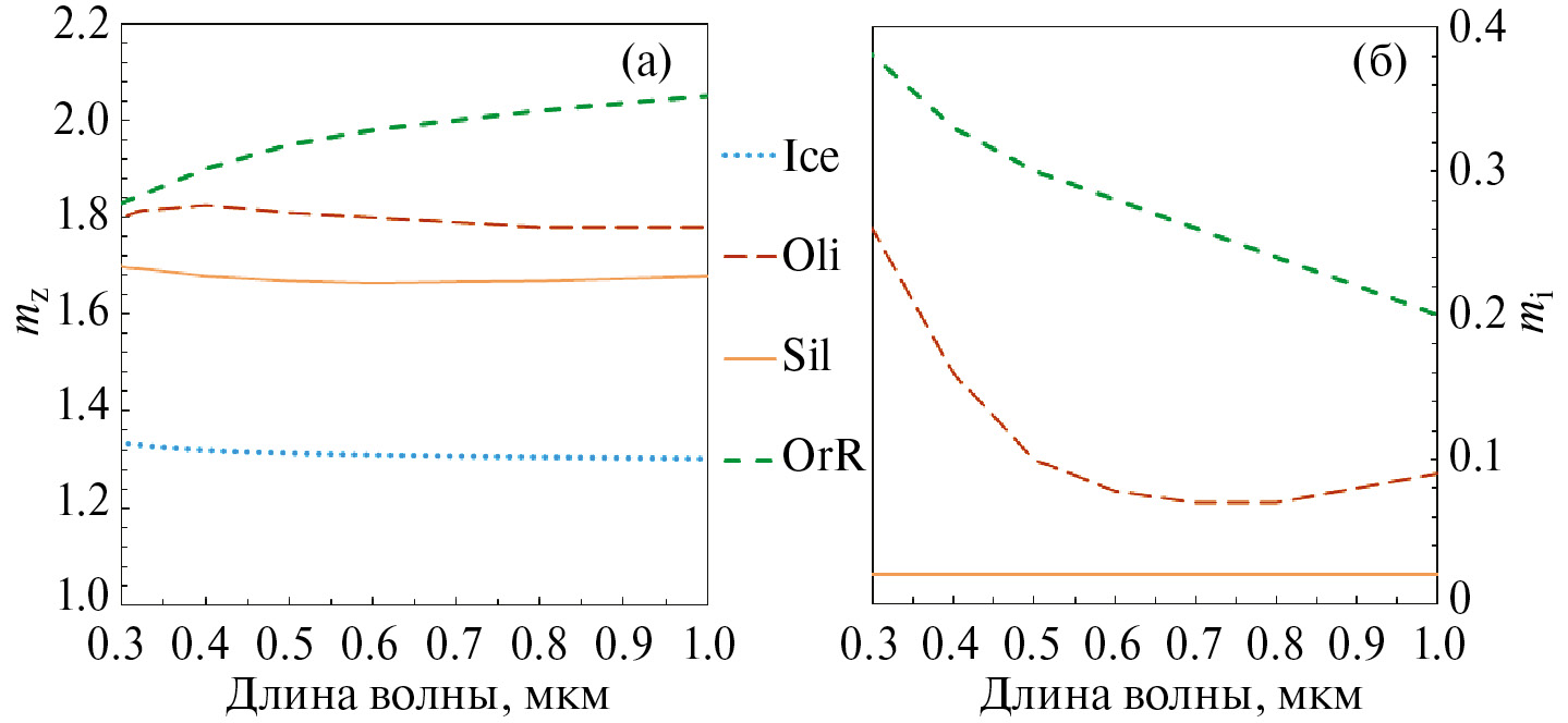 В качестве материала частиц для модельных расчетов характеристик рассеяния мы рассматривали восемь веществ: льды H2O и CO2, железомагнезиальные силикаты (оливины), так называемые астрономические силикаты (их оптические характеристики были получены на основе синтеза результатов лабораторных измерений и теоретического моделирования деталей в ИК-спектре для того, чтобы обеспечить согласие с данными ряда астрономических наблюдений), аморфный углерод, тугоплавкую органику и смеси органических веществ, известные как толины Титана и Плутона. Однако, поскольку часть этих материалов имеет близкие по спектральному поведению показатели преломления в рассматриваемом диапазоне, спектры интенсивности излучения, рассеянного частицами этих материалов, также близки. Поэтому ниже представлены модельные спектры отражения АА с экзосферой, содержащей агрегатные частицы, только для показателей преломления четырех материалов: льда H2O (Warren, Brandt, 2008), астрономических силикатов (Li, Greenberg, 1997), оливинов (Dorschner и др., 1995) и тугоплавкой органики (Li, Greenberg, 1997). Действительная mr и мнимая mi части показателей преломления этих веществ представлены на рис. 3.