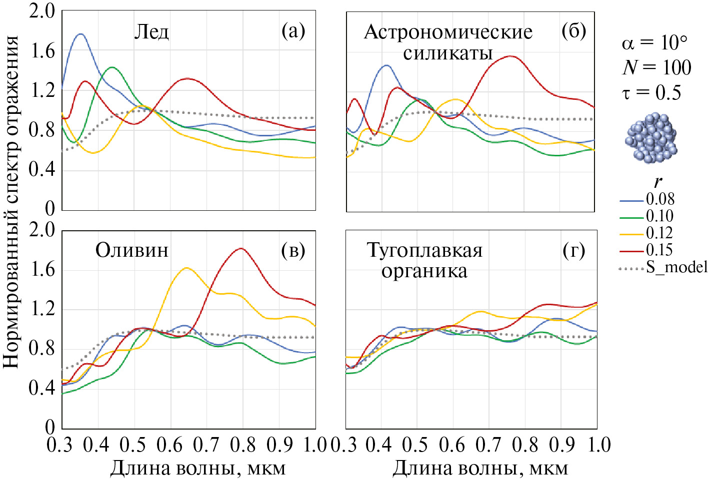 Рис. 4. Модельные нормированные (на длине волны 0.55 мкм) спектры отражения условного астероида С-типа при фазовом угле α= 10° (спектр отражения астероида без экзосферы показан точечной линией “S_model”). Экзосфера содержит плотно упакованные агрегатные частицы (структура показана справа), состоящие из 100 мономеров указанных радиусов r (в микронах) и указанного состава. Оптическая толщина экзосферы τ = 0.5.