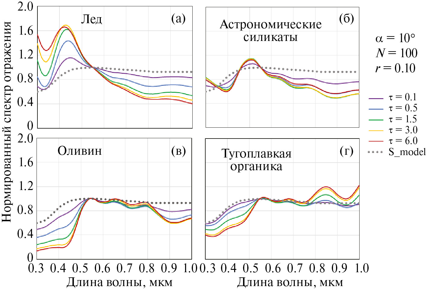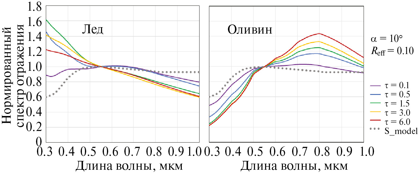 Влияние оптической толщины экзосферы на нормированный спектр отражения АА хорошо видно на рис. 6, где показаны модельные спектры для случая однородных субмикронных частиц льда и оливина в экзосфере. Очевидно, что присутствие частиц непоглощающего льда существенно поднимает коротковолновую часть спектра (аналогичное влияние оказывает присутствие слабопоглощающих астрономических силикатов), и с ростом оптической толщины до некоторого значения, обусловленного влиянием многократного рассеяния, этот эффект усиливается. Присутствие в экзосфере частиц, поглощающих в коротковолновом диапазоне, подавляет яркость в этом диапазоне и увеличивает положительный градиент спектра тем сильнее, чем больше τ.