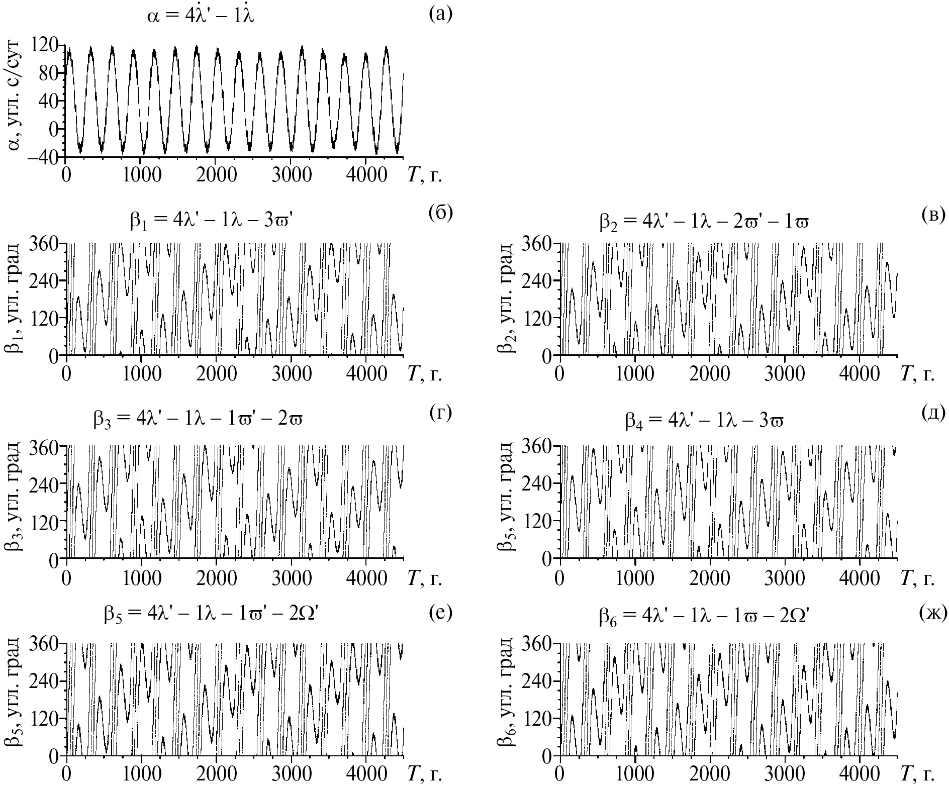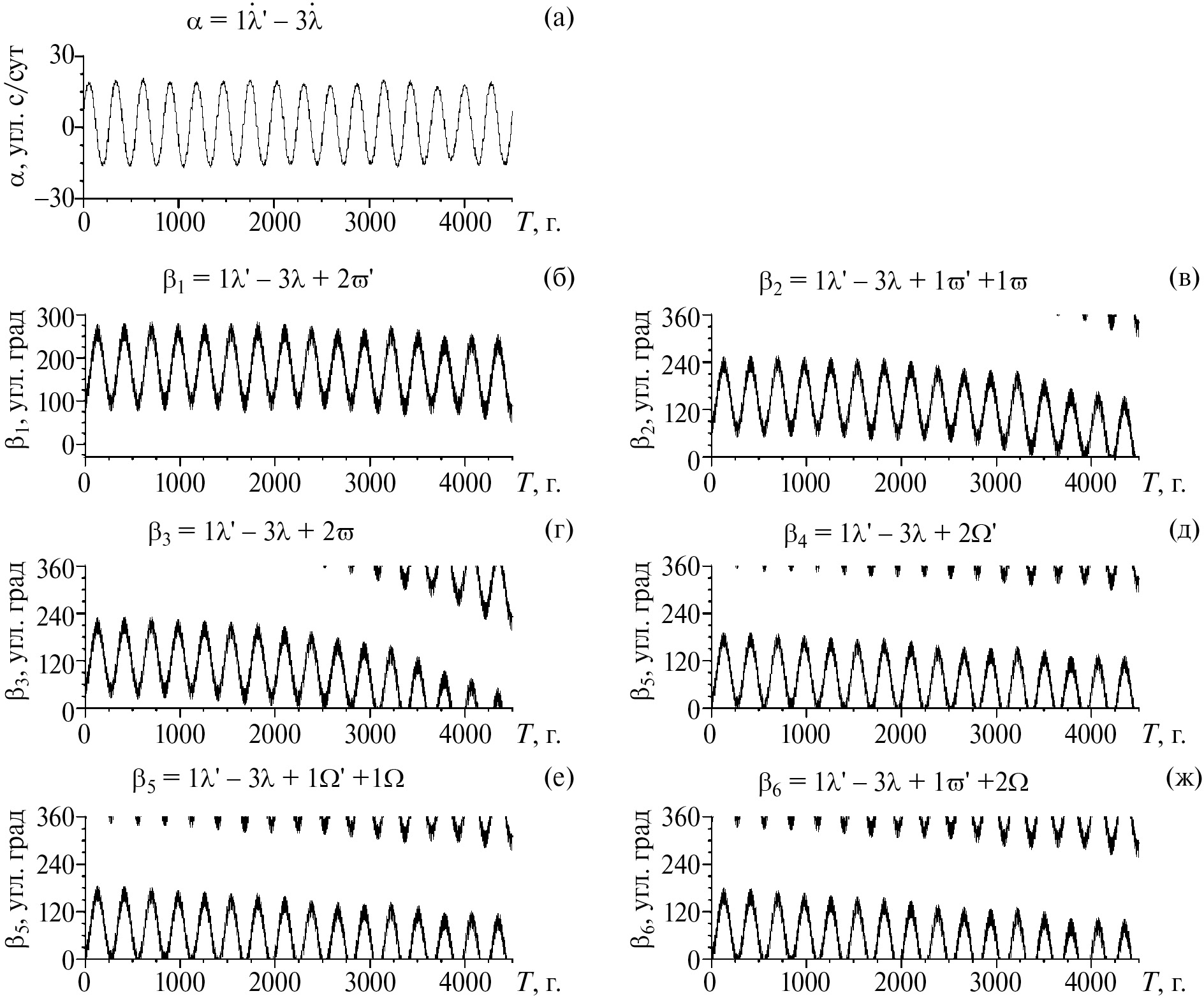 В качестве примера на рис. 1–3 приведем резонансные мультиплеты для разного типа резонансного взаимодействия. Рис. 1 демонстрирует пример устойчивого резонанса 3/1 астероида 2019 JZ6 с Юпитером. На интервале времени (0, 4500) лет была построена эволюция его орбитальных элементов, резонансной щели и шести аргументов, формирующих мультиплет этого резонанса. На рис. 1 на графике (а) приводится эволюция α, на графике (б) – основной критический аргумент β1, определяемый выражением (5), а затем остальные аргументы резонансного мультиплета. Астероид 2019 JZ6 находится в устойчивой геометрической конфигурации “астероид–Юпитер”, которая защищает его от сближений с планетой на рассматриваемом интервале времени. Из графика эволюции резонансной щели видно, что α регулярно колеблется около нуля с небольшой амплитудой, а критические аргументы резонансного мультиплета либрируют. Можно заметить, что для всех аргументов амплитуда колебаний составляет примерно 100°, но смещается центр либрации. При этом тип резонанса сохраняется для всего мультиплета.
