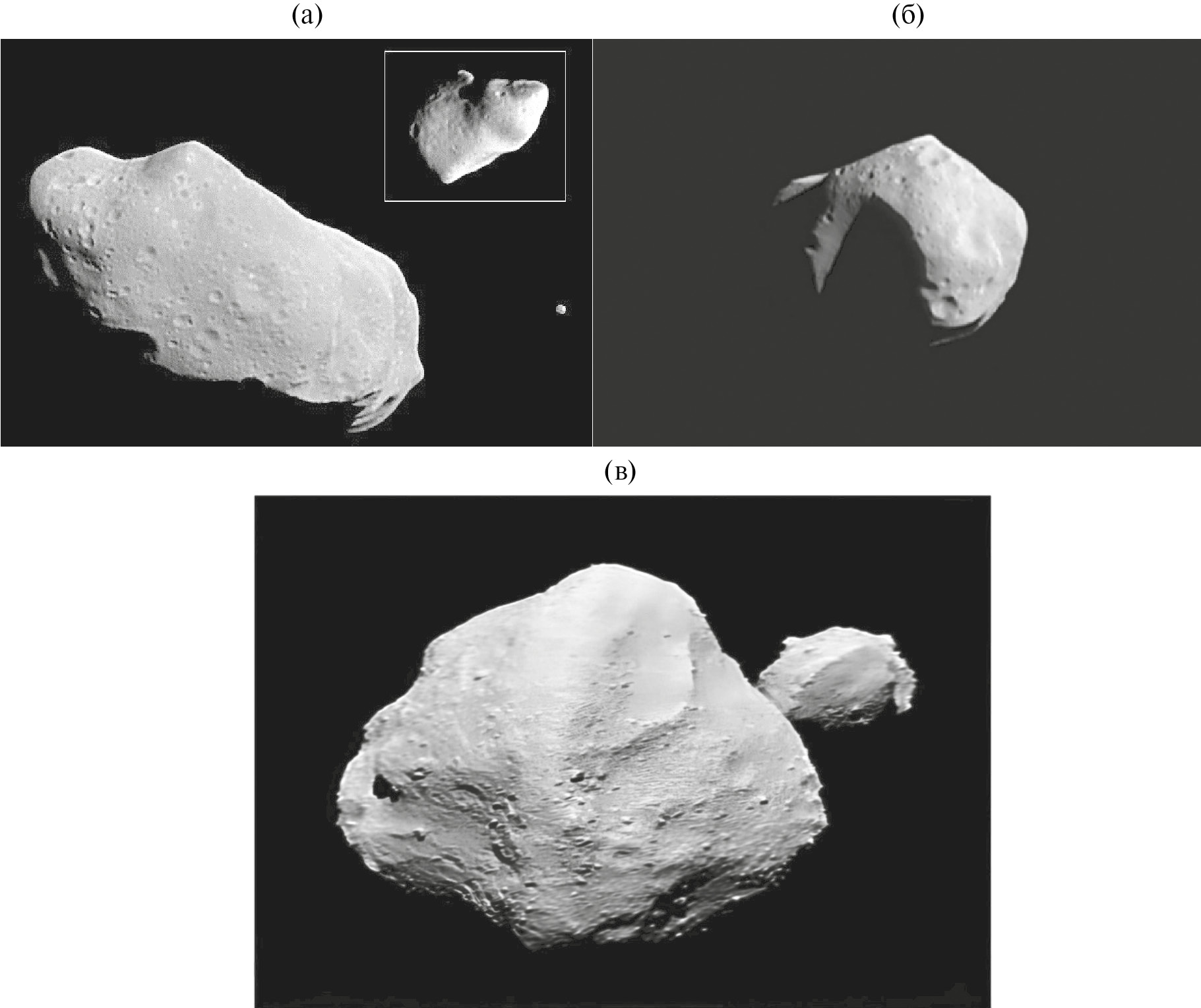 Рис. 1. Пример снимков астероидов, полученных с борта космических аппаратов: (а) – фотография астероида 253 Матильда, сделанная во время его облета (27.06.1997 г.) аппаратом NEAR (https://nssdc.gsfc.nasa.gov/imgcat/html/object_page/nea_19970627_mos.html (дата обращения 02.11.2023) ©NASA/JPL; (б) – фотография астероида Главного пояса 243 Ида и его спутника I Дактиль (18.10.1989 г.), сделанная с автоматической межпланетной станции Galileo при полете к Юпитеру ©NASA/JPL (https://photojournal.jpl.nasa.gov/catalog/PIA00119 (дата обращения 02.11.2023); (в) – фотография астероида 152830 Динкинеш ©NASA/Goddard/SwRI/Johns Hopkins APL/NOAO (https://www.nasa.gov/image-article/nasas-lucy-spacecraft-discovers-2nd-asteroid-during-dinkinesh-flyby/ (дата обращения 02.11.2023)).