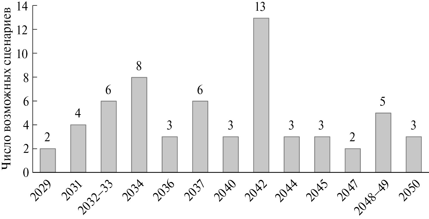 Всего удалось найти 62 возможных сценария полета КА (55 уникальных и 7 дублирующих, см. табл. 1, рис. 2), удовлетворяющих ограничениям на ΔV0. На рис. 2 показано распределение количества возможных сценариев по годам запуска. Отметим, что пролет некоторых астероидов возможен для нескольких различных сценариев при запуске миссии в разные окна старта.