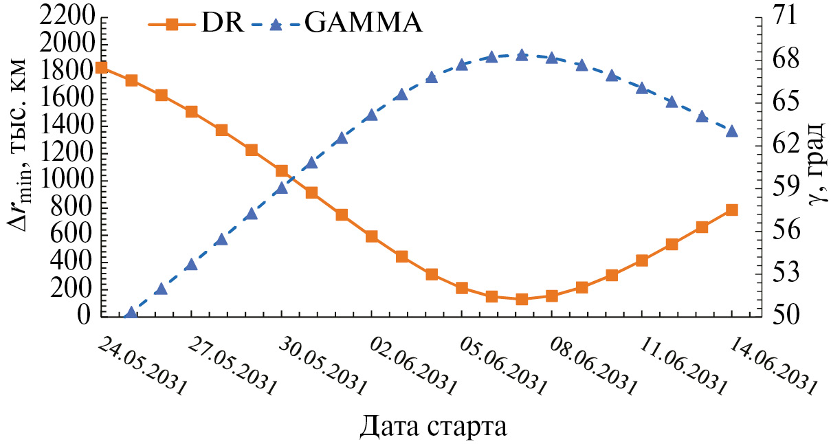 - Определение минимального расстояния (Δrmin), на которое КА сближается с астероидом, и соответствующего момента времени сближения. Предварительный отбор астероидов, для которых Δrmin меньше некоторой величины , в настоящей работе на основе многократных расчетов принято ограничение = 20 млн км.
