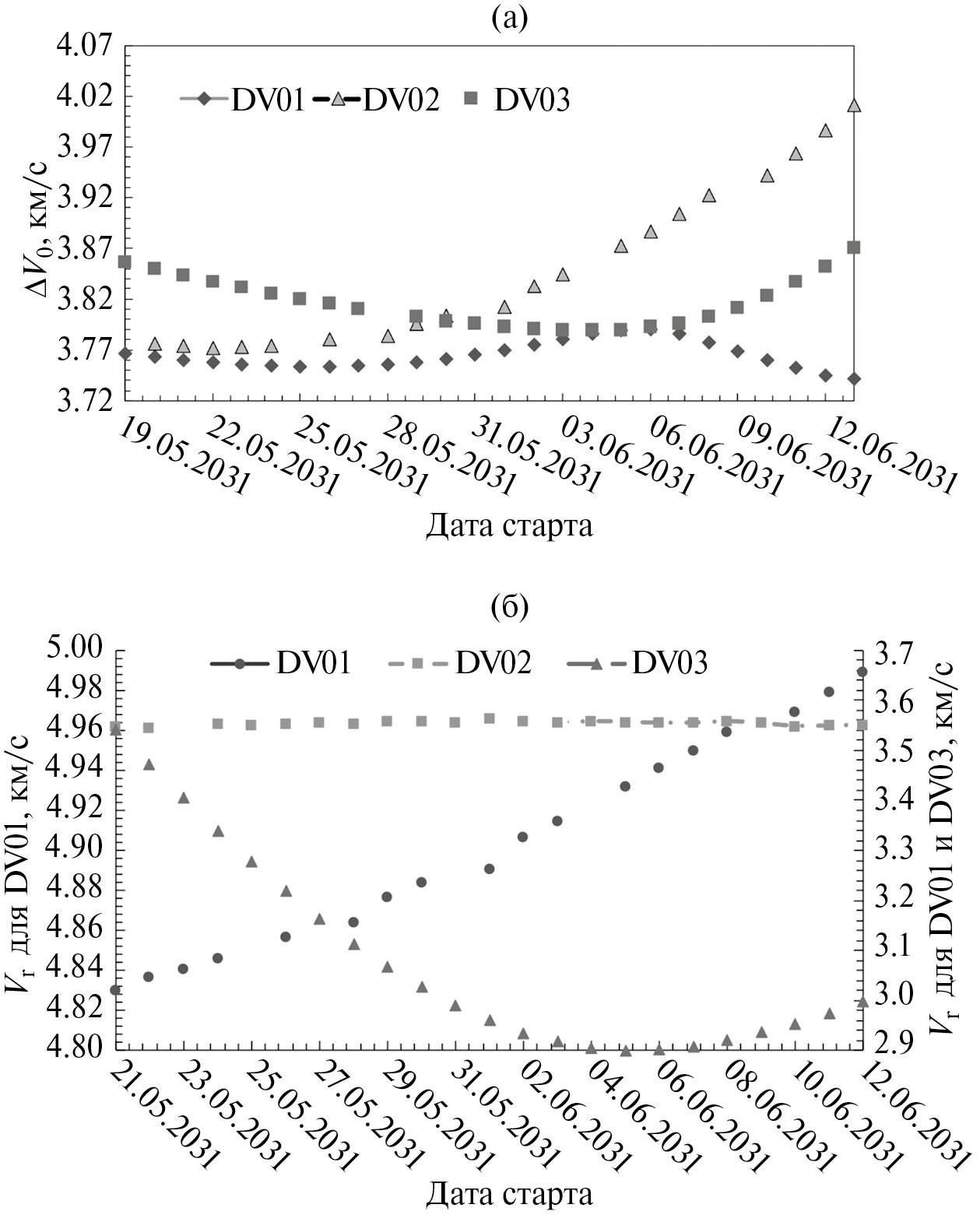 Заметим, что максимально возможная величина стартового импульса может быть выбрана из практических соображений; как правило, эта величина для венерианских миссий колеблется в пределах от ~3.66 до ~4.2 км/с (Glaze и др., 2018; Eismont и др., 2019). Однако в настоящей работе это значение было увеличено до 4.5 км/с, поскольку в этом случае становится возможным пролет на витке резонансной орбиты некоторых астероидов, которые представляют особую научную ценность, и рассмотрение сценария с облетом этих астероидов может существенно повысить научную значимость миссии в целом, что оправдывает необходимость увеличения энергетических затрат. Поэтому авторами было принято решение включить данные траектории в общий список возможных сценариев.