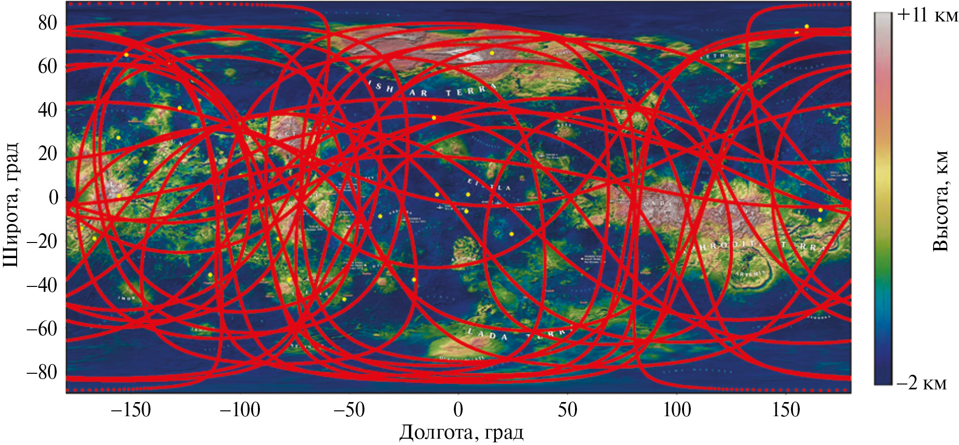 Приведем на рис. 7 суммарную достижимую область посадки на поверхности Венеры для дат старта с 2029 по 2040 гг., построенную с учетом данных табл. 4 для величины угла входа в атмосферу –12°. На рис. 7 приведены координаты центров окружностей посадки, получаемые при реализации полученных в данном исследовании траекторий перелета КА к Венере с облетом астероида в окна старта с 2029 по 2040 гг. Можно увидеть, что большая часть поверхности Венеры может быть достигнута при реализации траекторий полета КА с облетом и Венеры, и астероида. Отдельно отметим, что большая часть центров окружностей посадки лежит в пределах –180 ≤ λ ≤ 0 по долготе (град) и 0 ≤ φ ≤ 90 по широте (град).