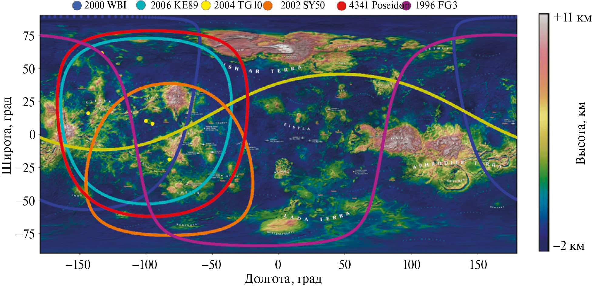 На рис. 8 приведена карта поверхности Венеры с отображенными на ней окружностями посадки, которые могут быть достигнуты при полете КА с пролетом астероида. Окружности посадки построены для угла входа –12° (табл. 3).