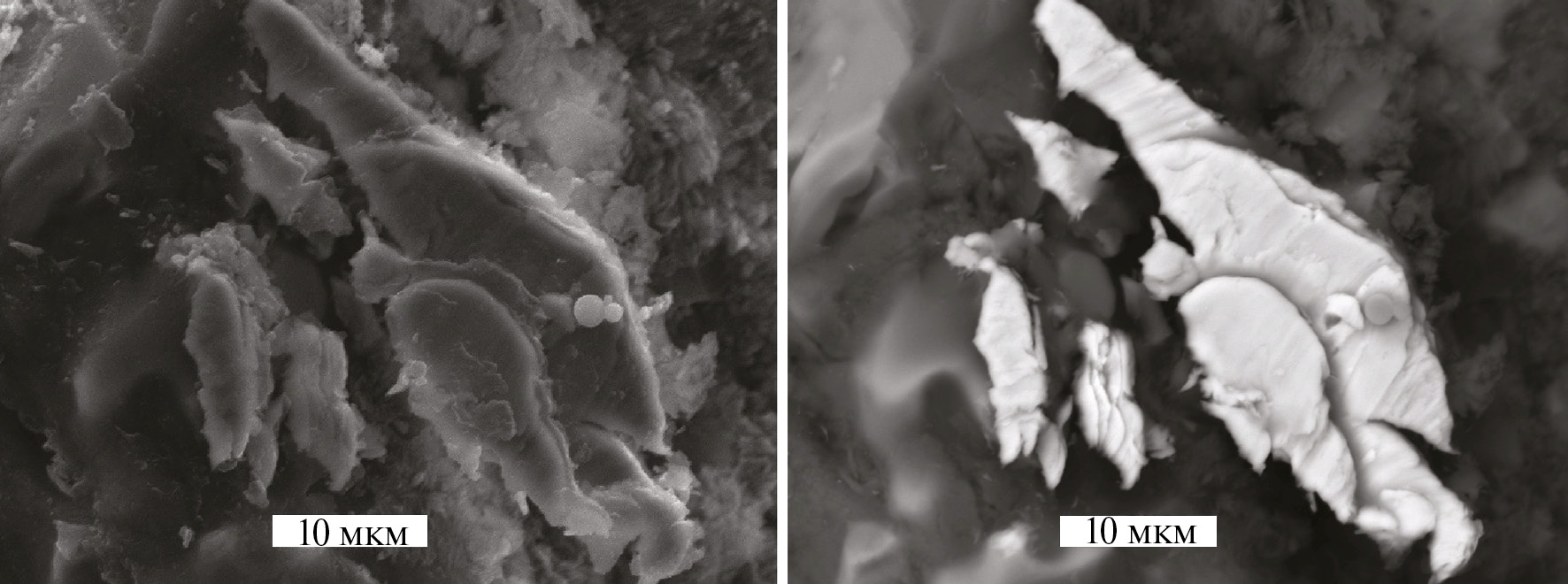 В нескольких образцах импактного стекла из кратера Лонар были обнаружены яркие по контрасту в отраженных электронах листовидные Ni–Cu содержащие частицы размером от 10 до 30 мкм (рис. 4). На снимке во вторичных электронах видно, что обнаруженные частицы утоплены в стеклянной матрице, а также покрыты стеклянной пленкой. Кроме того, на поверхности самой крупной частицы зафиксировано несколько стеклянных шариков размером 2 и 0.5 мкм. Размер и морфология этих шариков указывают на их расплавную природу.