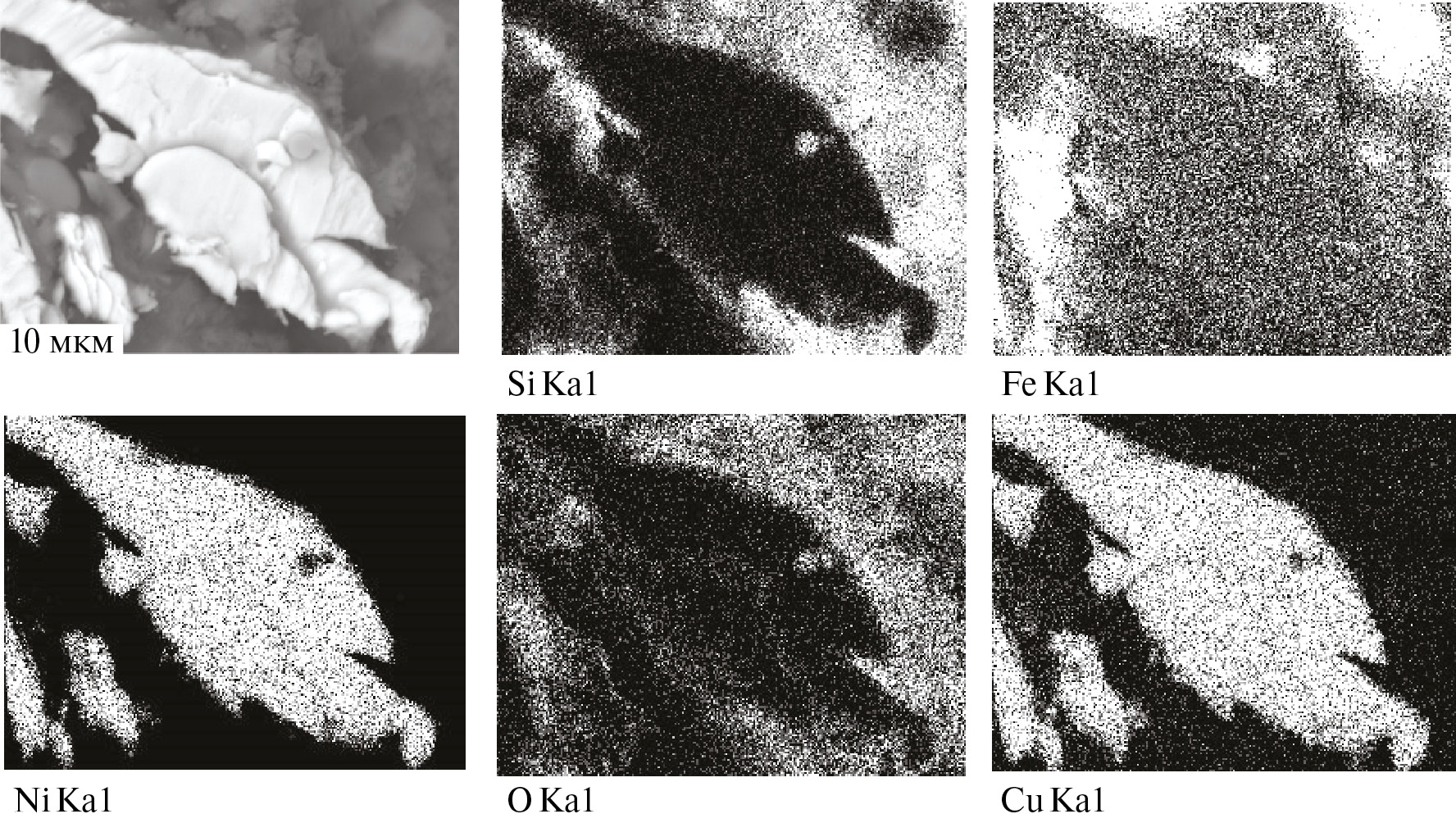 Достаточно большой размер обнаруженных частиц позволил получить карты распределения элементов (рис. 5). Карты распределения элементов, полученные от наиболее крупной из частиц, выявили, что в ее составе кроме никеля и меди не содержится других элементов, а отсутствие кислорода подтвердило самородный ее характер. На карте распределения кремния отчетливо видна его локализация в стеклянных шариках на поверхности Ni–Cu содержащей частицы. Видимо, они имеют высококремниевый состав с небольшим содержанием железа.
