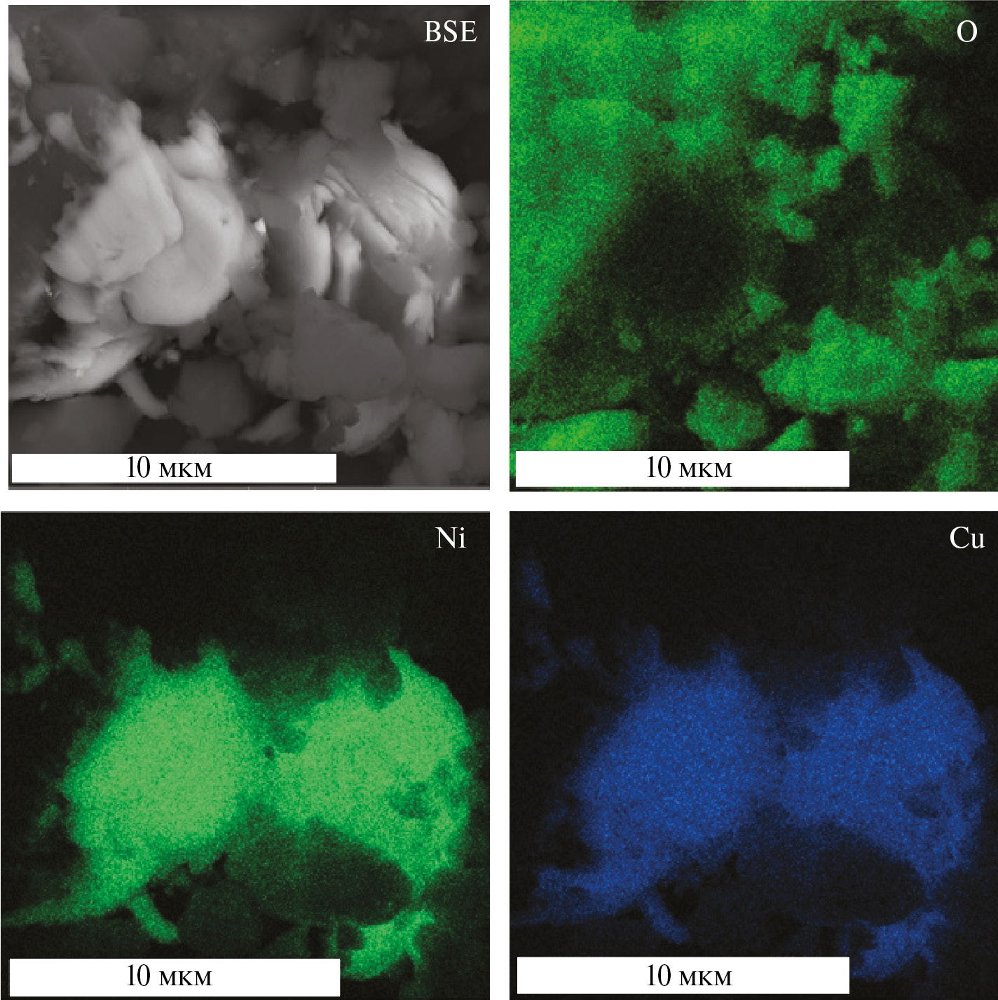 Стоит отметить, что морфология обнаруженных частиц и их агрегатов схожа с частицами подобного состава, обнаруженными в импактных стеклах кратера Лонар (рис. 5, рис. 6). Обнаружены как отдельные частицы псевдогексагональных очертаний, представленные сильно уплощенными вдоль одной из осей третьего порядка октаэдрами, так и их агрегаты размером около 10 мкм. На снимке во вторичных электронах видно стеклянное покрытие на поверхности этих частиц. Карты распределения (рис. 8) подтвердили локализацию меди и никеля в них, а также отсутствие кислорода. Расчет, выполненный на основе ЭДС-анализов, полученных от этих частиц, показал, что они имеют средний состав Ni2.11Cu0.89, что соответствует метрике Ni2Cu.