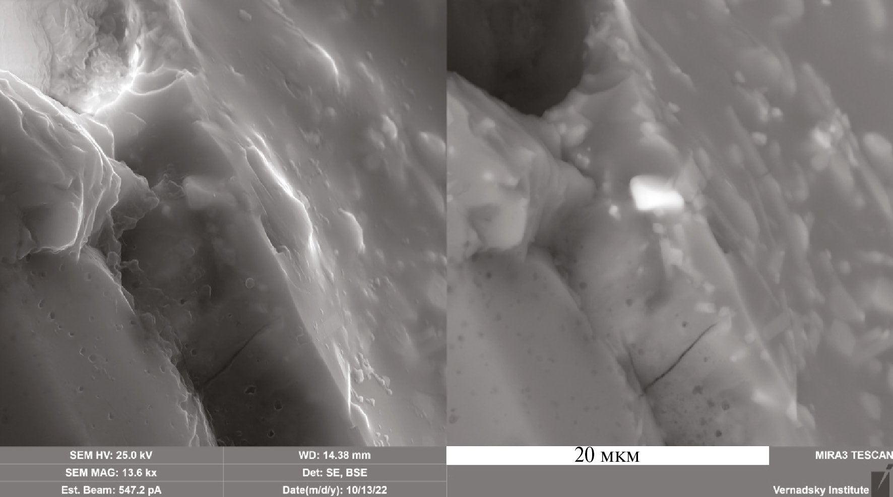 Рис. 7. Агрегат листовидных частиц Ni2Cu в матрице стекла лунного реголита. Луна-24. СЭМ. Слева – вторичные электроны. Справа – отраженные электроны.