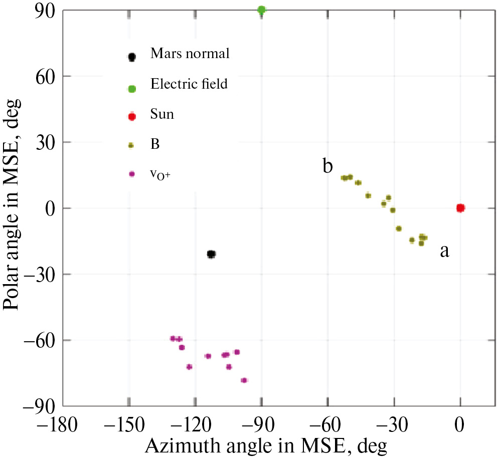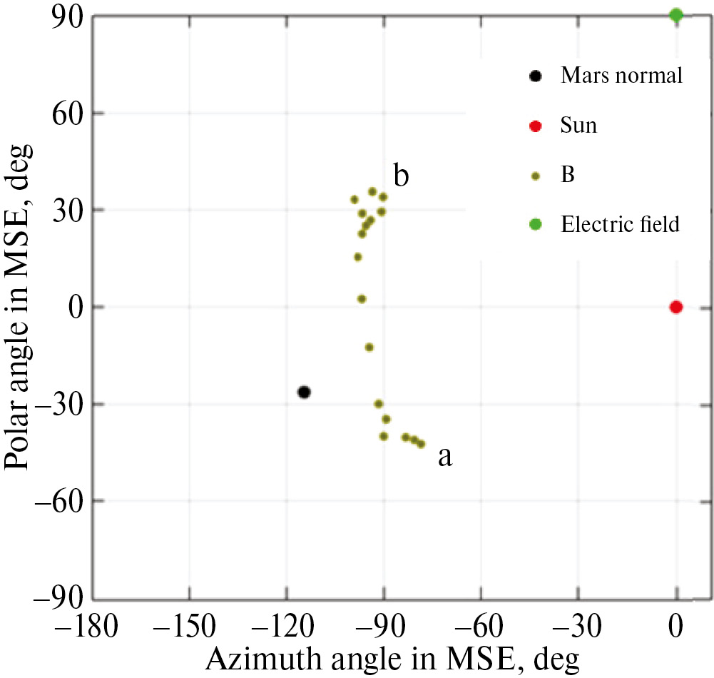 На рис. 3 показано быстрое вращение магнитного поля приблизительно вдоль азимутального угла – 90о на полярный угол ~60°. Эта часть магнитопаузы окружена двумя медленными интервалами магнитных полей: линейным “a” и вращательным “b”.