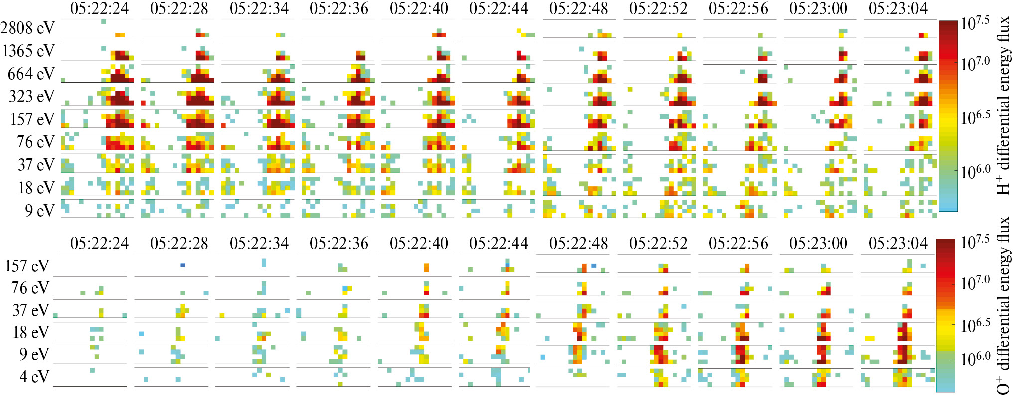 На рис. 8 показаны угловые распределения дифференциальных потоков H+ и O+ во временном промежутке с 05:22:24 UT по 05:23:04 UT в области между магнитослоем и магнитосферой. Верхнее распределение ионов n+ сравнительно ровно уменьшается слева направо, нижнее распределение ионов O+ увеличивается сравнительно ровно от очень малого к значительному распределению. Надо учесть, что ионы O2+ не включены в график, и добавляют более чем вдвое массу, чем O+. Оценка сравнительного в данном случае вклада массы не проводилась, а базируется на динамическом вкладе компонентов.