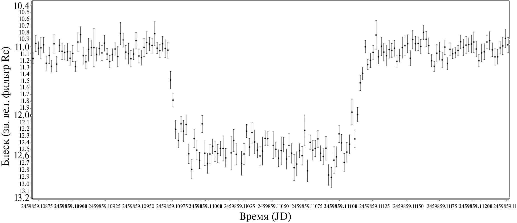“Дно” кривой блеска покрытия, соответствующее интервалу времени, когда звезда полностью закрыта Тритоном, состоит из 9 точек, его продолжительность – от 62 до 78 с. Эфемеридные значения на момент покрытия следующие: угловая скорость Тритона – 0.065"/мин., угловой диаметр – 0".129 (вычисления выполнялись с помощью программного пакета ЭПОС (Львов, Цекмейстер, 2012)). Таким образом, центральное покрытие должно было занять около 119 с. Из результатов наблюдений видно, что наблюдаемое покрытие было нецентральным.
