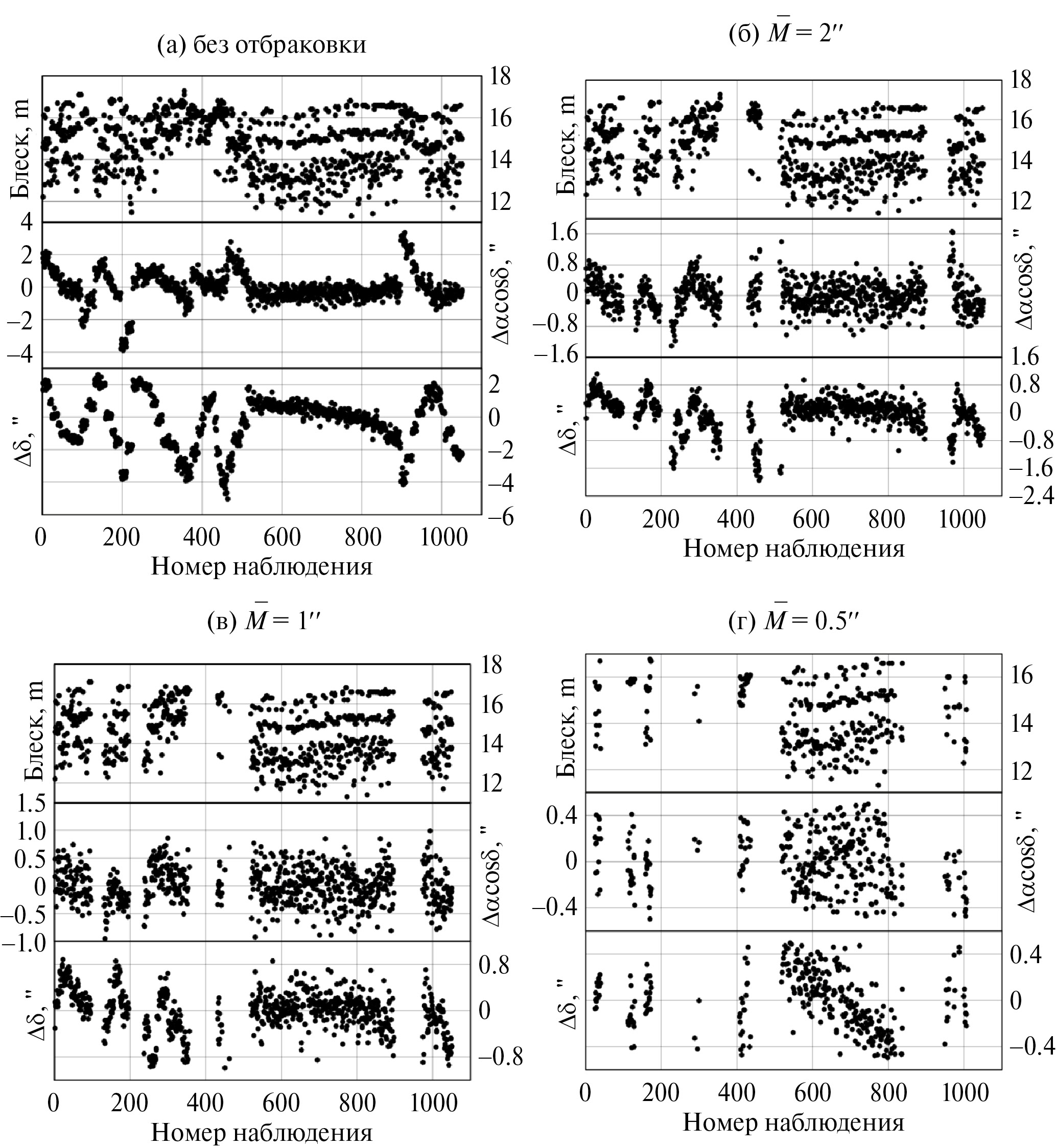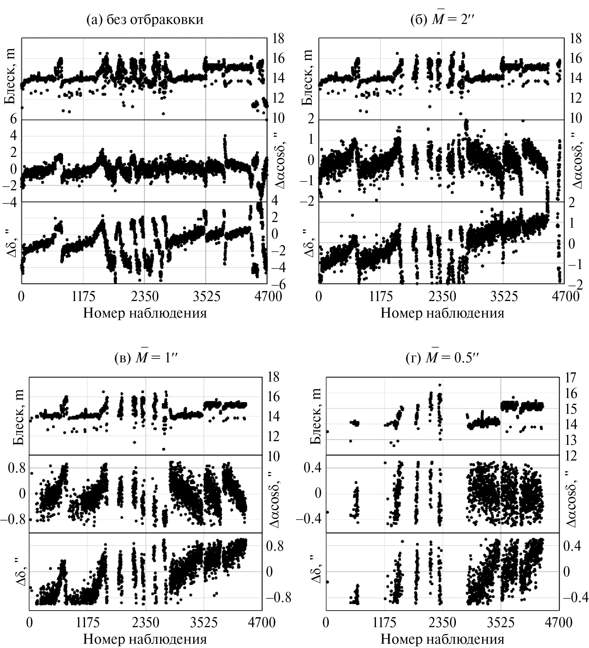 Важную роль в получении статистически значимых результатов играет отбраковка ошибочных или недостаточно точных наблюдений. Как показано в замечательной книге Шейнина “История теории ошибок” (Шейнин, 2007), проблема отбраковки измерений восходит к работам Гаусса и Лапласа и сколько-нибудь обоснованным является так называемое правило 3σ, где σ – среднеквадратичная ошибка, полученная в процессе улучшения орбиты по совокупности наблюдений. При этом, как показывает Шейнин, в каждой области науки, работающей с наблюдениями, существуют свои правила их отбраковки, полученные из практического опыта.