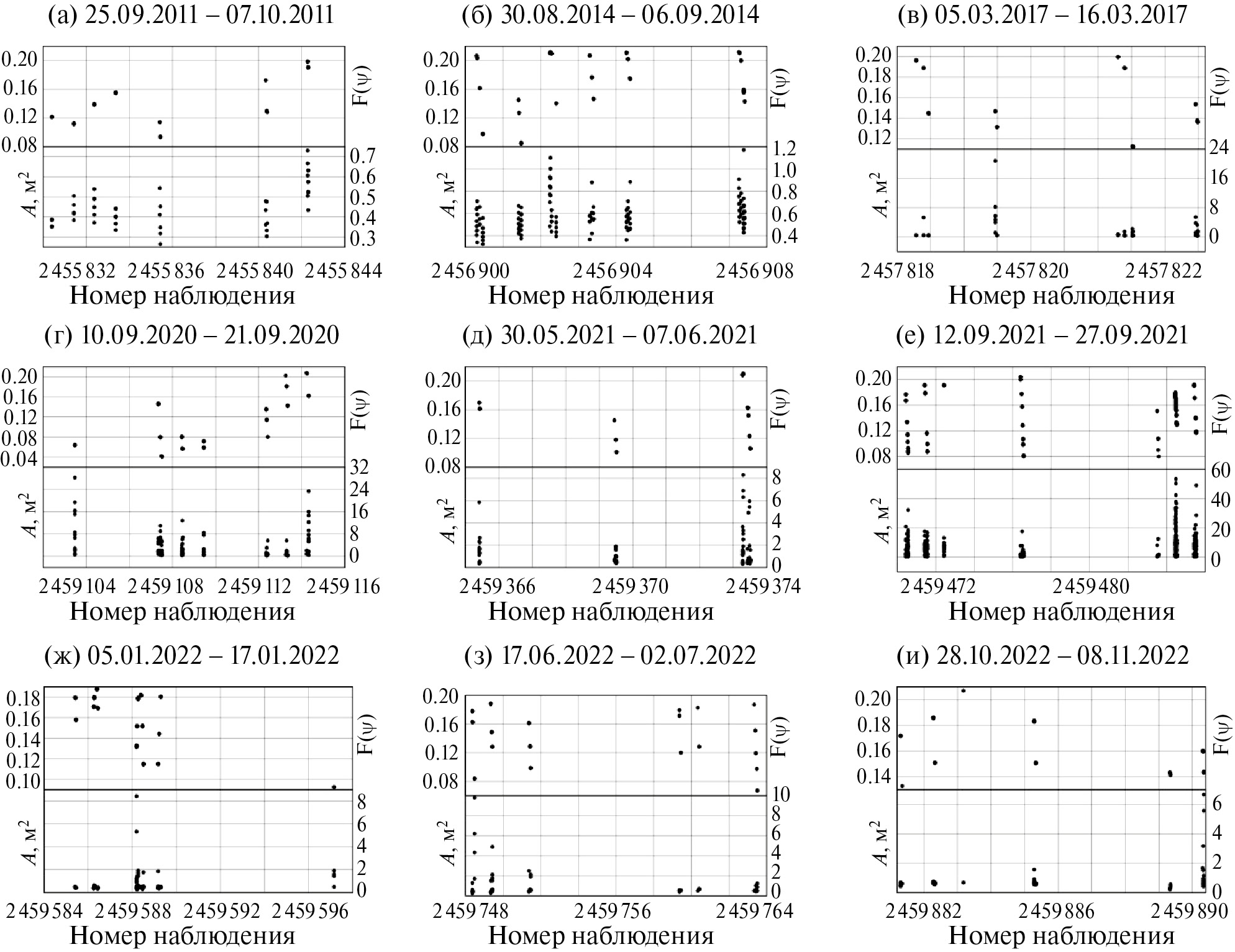 Как показывают данные, приведенные в табл. 16, разброс всех определенных значений параметров и, в том числе, площади миделевого сечения спутника, очень велик, а соответственно велик и разброс масс. Определенные по данным фотометрии изменения площади миделевого сечения (рис. 6) подтверждают тот факт, что объект плоский, причем он наблюдается как бы сбоку, но при этом освещено ребро и основная плоскость тоже частично освещена. За все сеансы наблюдения максимальная освещенная плоская часть поверхности наблюдалась один раз в сентябре 2021 г., а минимальная – дважды в сентябре 2011 г. и в августе–сентябре 2014 г.