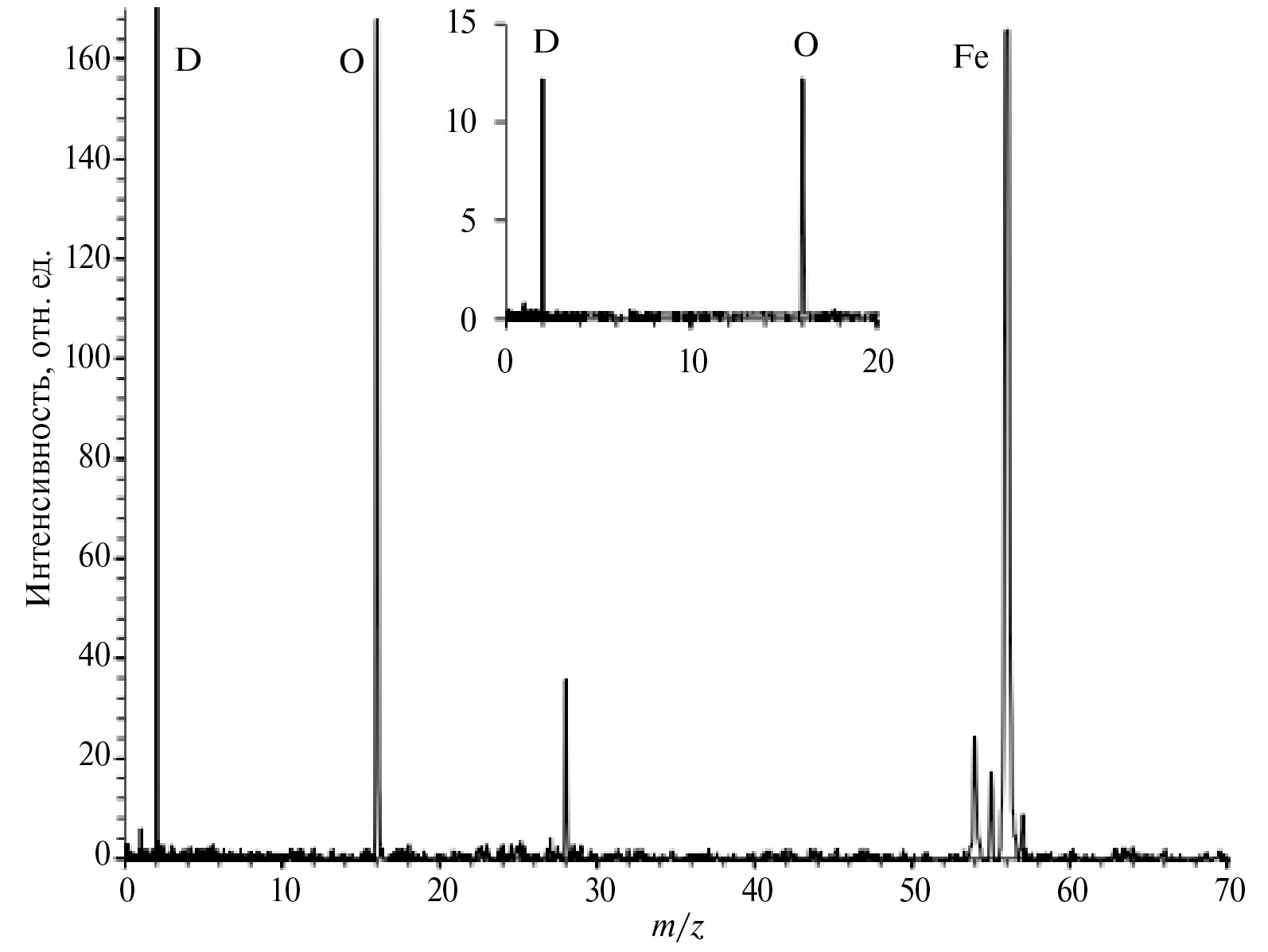 Рис. 5. Масс-спектр порошка Fe3O4 с 40% D2O. Вставка представляет собой часть того же спектра в наименее чувствительном канале.