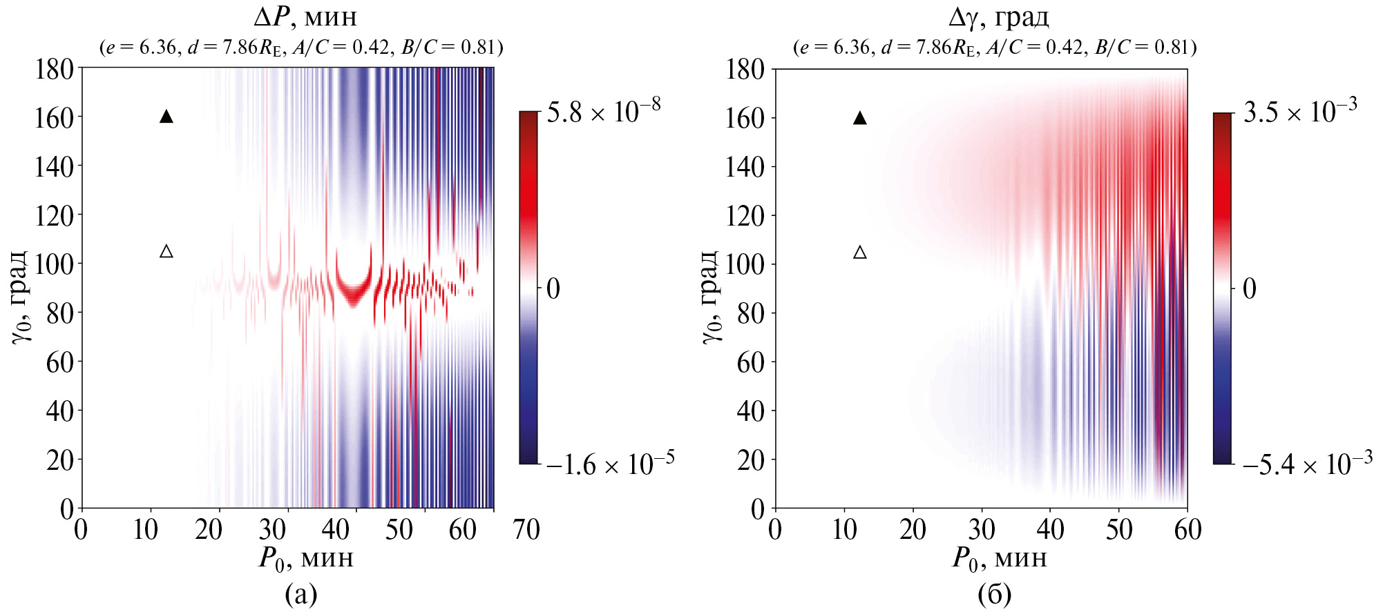 Рис. 4. Изменение вращательного состояния астероида Дуэнде из-за сближения с Землей в 2013 г. в зависимости от P0 и γ0: (а) – изменение ΔP периода вращения; (б) – изменение Δγ угла, характеризующего отклонение оси вращения астероида от нормали к плоскости орбиты. Треугольниками указаны возможные положения Дуэнде согласно данным из табл. 1.
