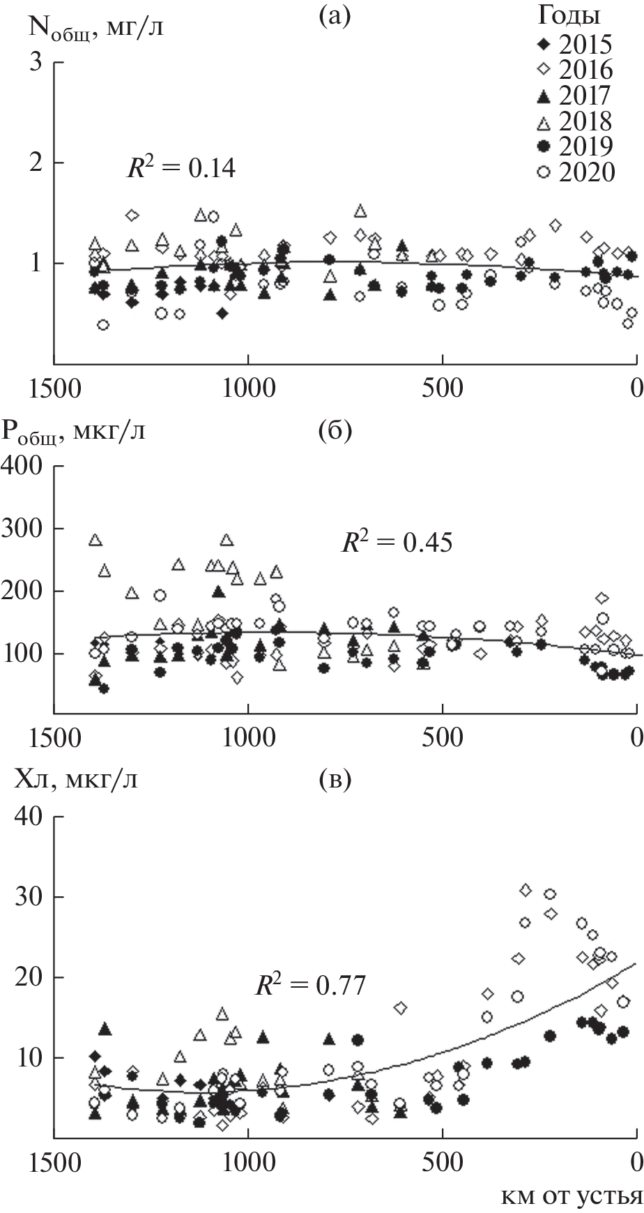 Based on field observations carried out during the 2015–2020 summer low water period, the interannual variability of abiotic characteristics and chlorophyll content in the Lower Volga is considered. In years with different thermal conditions and water content, the temperature, transparency, color and electrical conductivity of water are characterized by small variability and demonstrate changes from north to south, according to the zonal features of the Volga cascade. The average nutrient content (0.81–0.99 mg/L Ntot and 101–134 μg/L Ptot) changes insignificantly in the Saratov and Volgograd reservoirs, but decreases in the unregulated lower part of the Volga. The content of N-N\({\text{O}}_{3}^{ - }\) and P-P\({\text{O}}_{4}^{{3 - }}\) in the total nitrogen and phosphorus pool respectively, is 4–9 and 69–74%, the ratio Ntot/Ptot < 10 indicates a possible nitrogen limitation of phytoplankton. The Chl a content corresponds to the mesotrophic category in the Saratov and Volgograd reservoirs (5.3 ± 0.6 and 7.2 ± 0.9 μg/L), and eutrophic in the lower section (13.9 ± 1.5 μg/L). The trophic status of the Lower Volga has not changed in comparison with the last decade of the 20th century. It was found that abiotic factors have a weak effect on the Chl a content in the Saratov reservoir, moderate in the Volgograd reservoir and almost completely control the development of phytoplankton in the unregulated lower part of the Volga (R2 = 0.21, 0.59, and 0.91). The data obtained supplement the observations of previous years and form the basis for long-term monitoring of ecosystems of large artificial reservoirs.