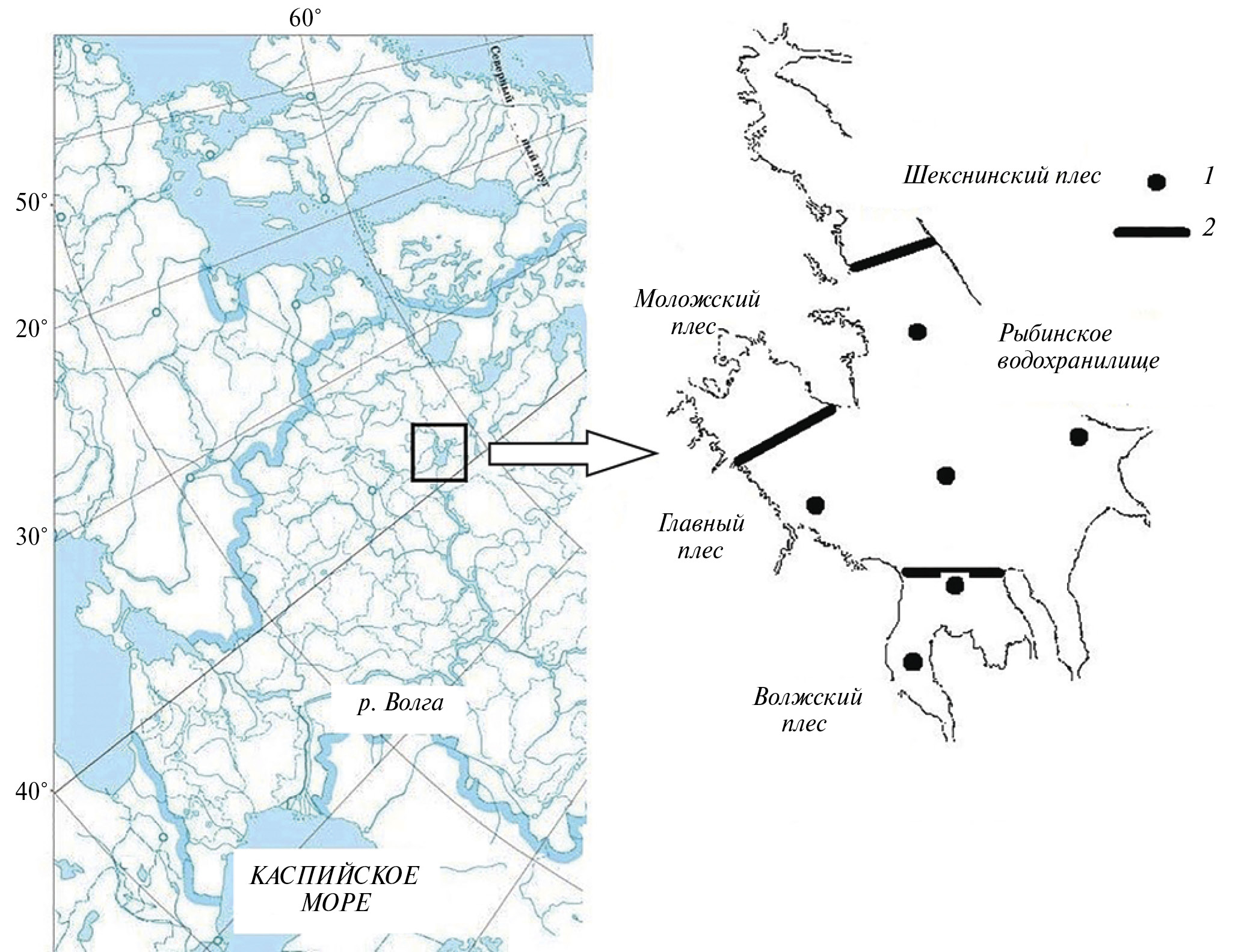 Рис. 1. Карта-схема Рыбинского водохранилища. 1 – станции многолетних наблюдений, 2 – границы плесов.