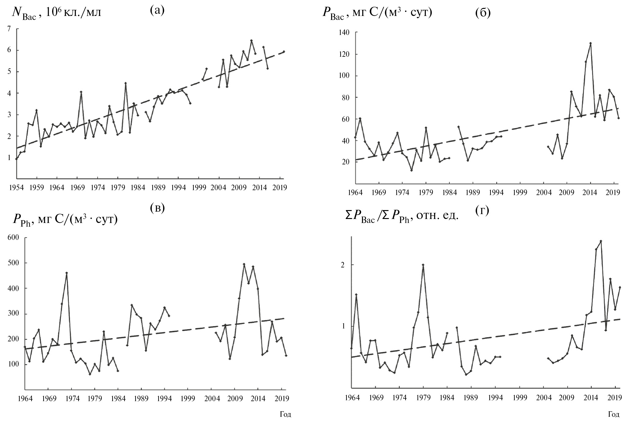 Рис. 3. Многолетняя динамика средних за вегетационный сезон микробиологических показателей в Рыбинском водохранилище: а — численность бактериопланктона (NBac); б — продукция бактериопланктона (PBac); в — интенсивность фотосинтеза фитопланктона (PPh); г — соотношение бактериальной продукции и первичной (в сумме с внеклеточной продукцией водорослей) продукции в толще воды под 1 м2 (∑PBac/∑PPh). Пунктирные линии — линии тренда.