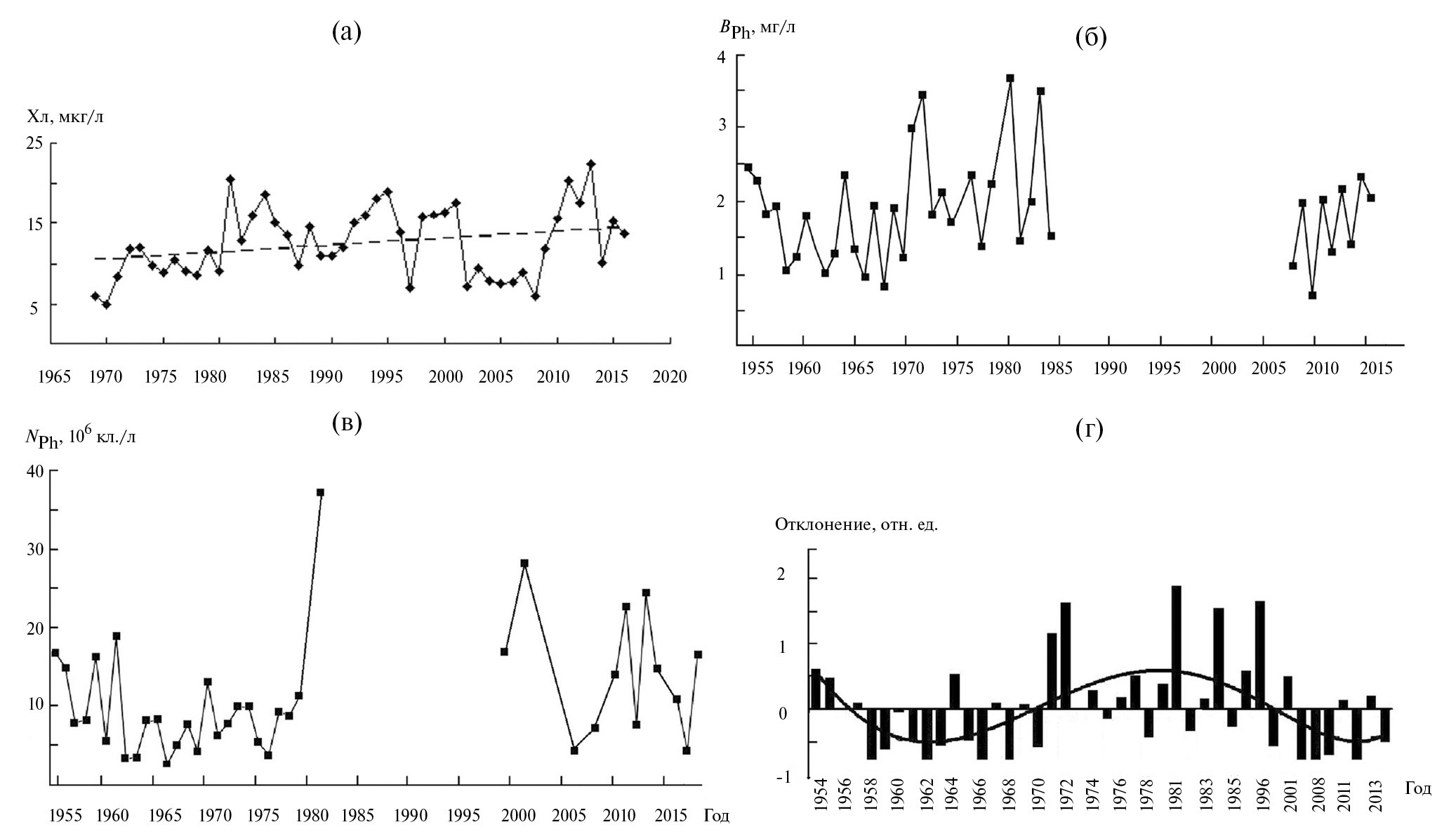 Рис. 4. Многолетняя динамика средних за вегетационный сезон показателей развития фитопланктона Рыбинского водохранилища: а — содержание Хл а (пунктир — линия тренда), б — биомасса фитопланктона (ВPh), в — численность фитопланктона (NPh), г — отклонение биомассы от среднего показателя.