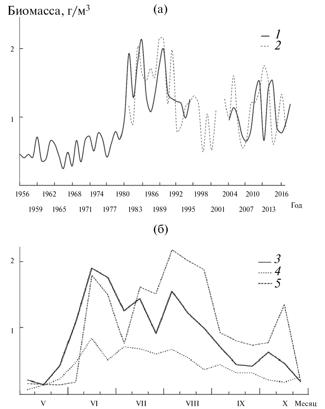 Хлорофилл определяли стандартным спектрофотометрическим методом в смешанном 90%-ном ацетоновом экстракте (SCOR-UNESCO, 1966): в 1969–2003 гг. на спектрофотометрах фирмы ЛОМО, с 2004 г. — PerkinElmer. Водоросли осаждали на мембранные фильтры с диаметром пор 3–5 мкм, которые высушивали в темноте при комнатной температуре и до анализа хранили в холодильнике. Концентрацию хлорофилла рассчитывали по уравнению из работы (Jeffrey, Humphrey, 1975).