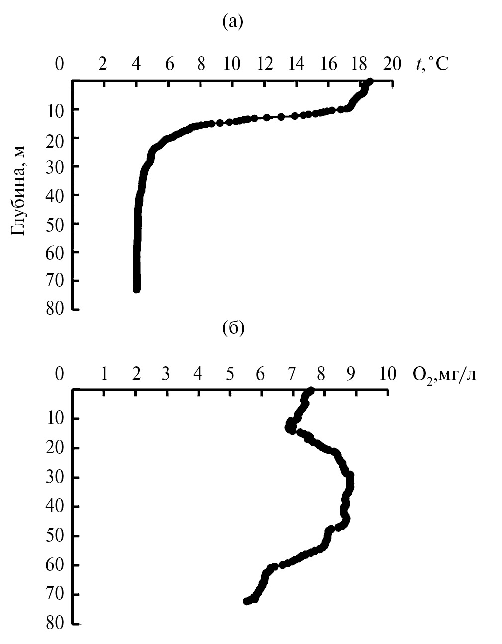 В наблюдаемый период температура у поверхности воды достигала 19.2°C, у дна — 4.3°С, термоклин располагался на глубинах 14–19 м, где температура резко снижалась с 16 до 8°C (рис. 1а). Температурный режим не отличался от многолетних данных для этого времени года.