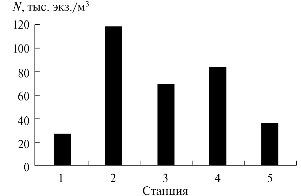 Рис. 2. Средняя численность зоопланктона (N, тыс. экз./м3) в столбе воды на станциях Малого Севана.