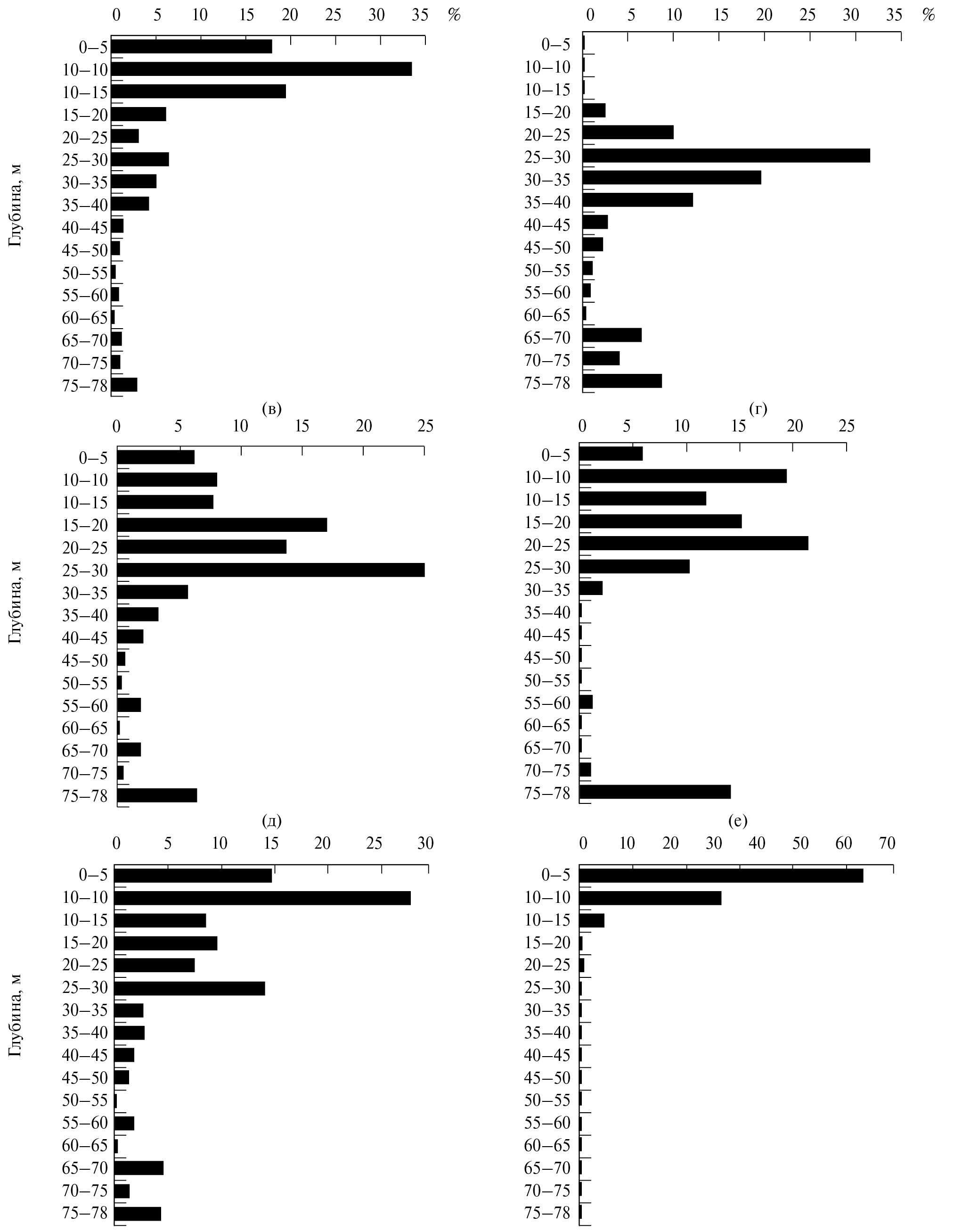 Рис. 4. Вертикальное распределение численности в столбе воды (%) Keratella quadrata (а), Filinia longiseta (б), Cyclops strenuus (в), C. abyssorum (г) Daphnia longispina (д) и Diaphanosoma lacustris (е).