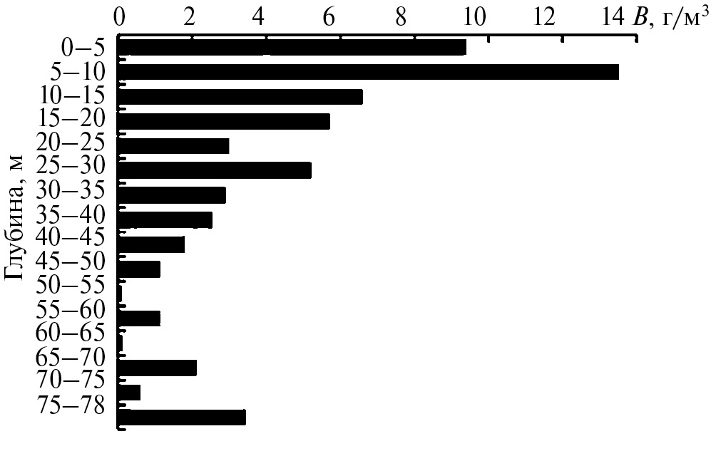Рис. 6. Вертикальное распределение биомассы (В, г/м3) зоопланктона в Малом Севане.