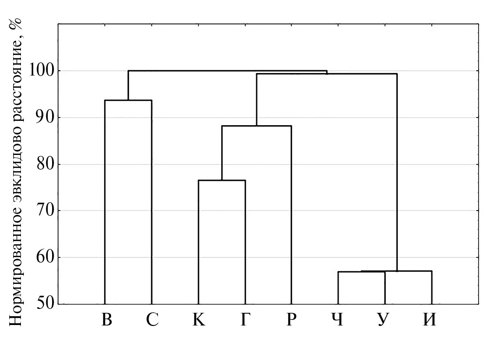 Рис. 1. Группировка водохранилищ р. Волги по уровню различия структуры доминантного комплекса. И — Иваньковское, У — Угличское, Р — Рыбинское, Г — Горьковское, Ч — Чебоксарское, К — Куйбышевское, С — Саратовское, В — Волгоградское водохранилище.