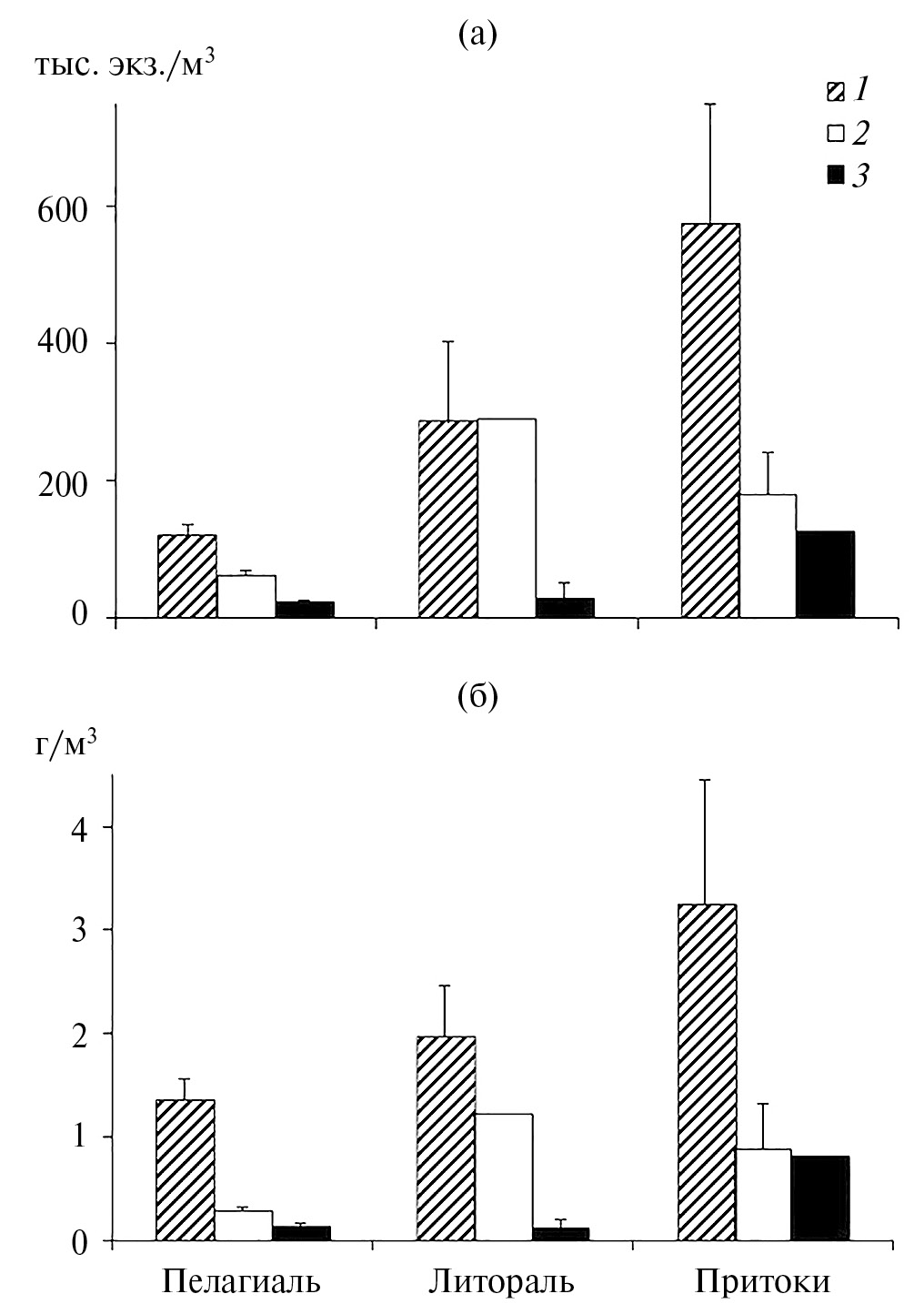 Средняя биомасса зоопланктона в Горьковском вдхр. в августе 2021 г. была низкой (0.3 г/м3), на речном участке водоема– <0.1 г/м3, на озерном – ≤0.8 г/м3. Это сопоставимо с таковой (0.2‒0.7 г/м3) в 2000‒2010‑х годах в речной части водоема (Ривьер, 2007; Шурганова, 2007; Lazareva et al., 2014). На его озерном участке в конце лета биомасса обычно выше и достигает 1‒4 г/м3 (Ривьер, 2007; Lazareva et al., 2014; Шурганова и др., 2017; Лазарева и др., 2018а).