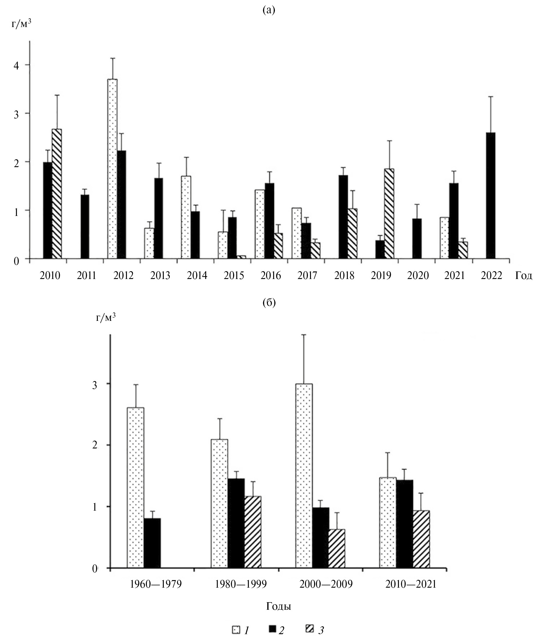 Низкой (в среднем 0.4 г/м3) была биомасса сообщества в Чебоксарском вдхр., ее значения совпадают с отмеченными сравнительно холодным летом 2008 г. (Lazareva et al., 2014). Низкие значения (0.1‒0.5 г/м3) указывают как обычные для верхней речной части водохранилища (Шурганова и др., 2003; Шурганова, 2007; Охапкин и др., 2016). В нижней озерной части водохранилища биомасса достигает >4 г/м3 (Шурганова, 2007; Lazareva et al., 2014), однако в 2021 г. на этом участке она тоже была небольшой (<0.8 г/м3).