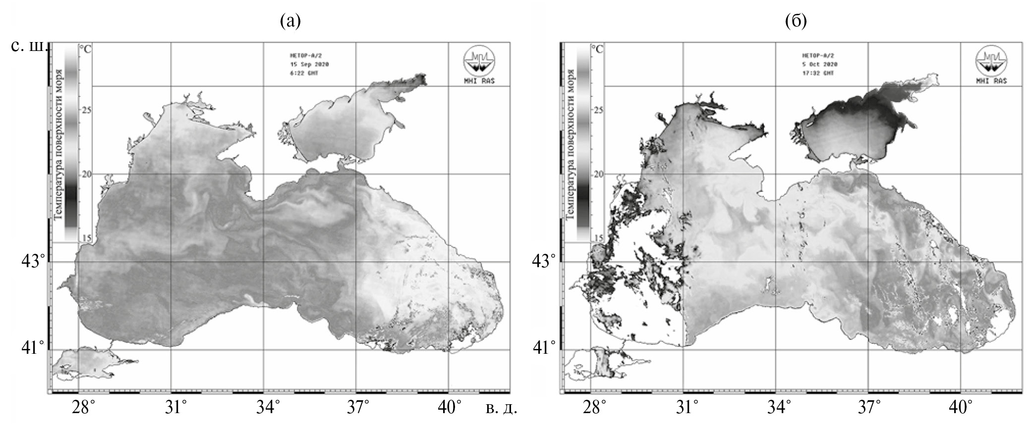 Рис. 1. Спутниковые карты распределения температуры поверхности моря в период выполнения ихтиопланктонной съемки: 15.09.2020 (а), 08.10.2020 (б) (Морской…, 2022).