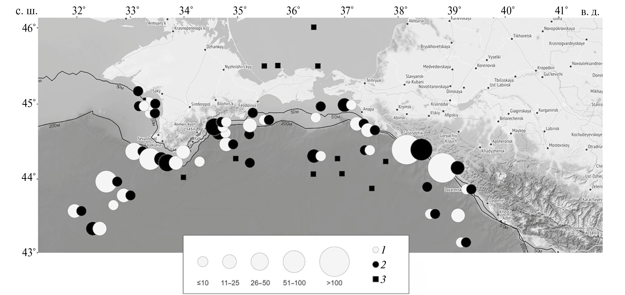 В черноморских пробах идентифицированы 19 видов икры и личинок рыб из 12 семейств. Тепловодные рыбы были представлены икрой и личинками 15 видов из 10 семейств, умеренноводные — четырьмя видами трех семейств. Количество видов и численность ихтиопланктона снижались от прибрежных к глубоководным районам исследований (табл. 1). В шельфовых водах ихтиопланктон отсутствовал только на одной станции (в Каламитском заливе), в глубоководных районах — на семи станциях (рис. 3). На шельфе в ихтиопланктоне идентифицировано 16 видов из 12 семейств (7 видов икры и 10 видов личинок). Средняя численность икры была 23.4, личинок — 7.2 экз./м2. В глубоководных районах отмечено 7 видов рыб из семи семейств — 3 вида икры и 5 видов личинок со средней численностью 15.9 и 6.4 экз./м2 соответственно. Доминировала E. encrasicolus, доля ее икры достигала 87.3 на шельфе и 98.1% — в глубоководных районах, личинок — 80.5 и 85.9% соответственно (табл. 1).