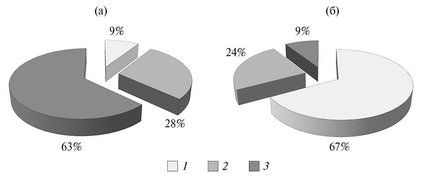 Рис. 4. Доля личинок Engraulis encrasicolus разных размерных групп по типу питания в сентябре–октябре 2016 (а) и 2020 (б) гг. 1 – желточный тип питания, 2 – смешанный, 3 – внешний.
