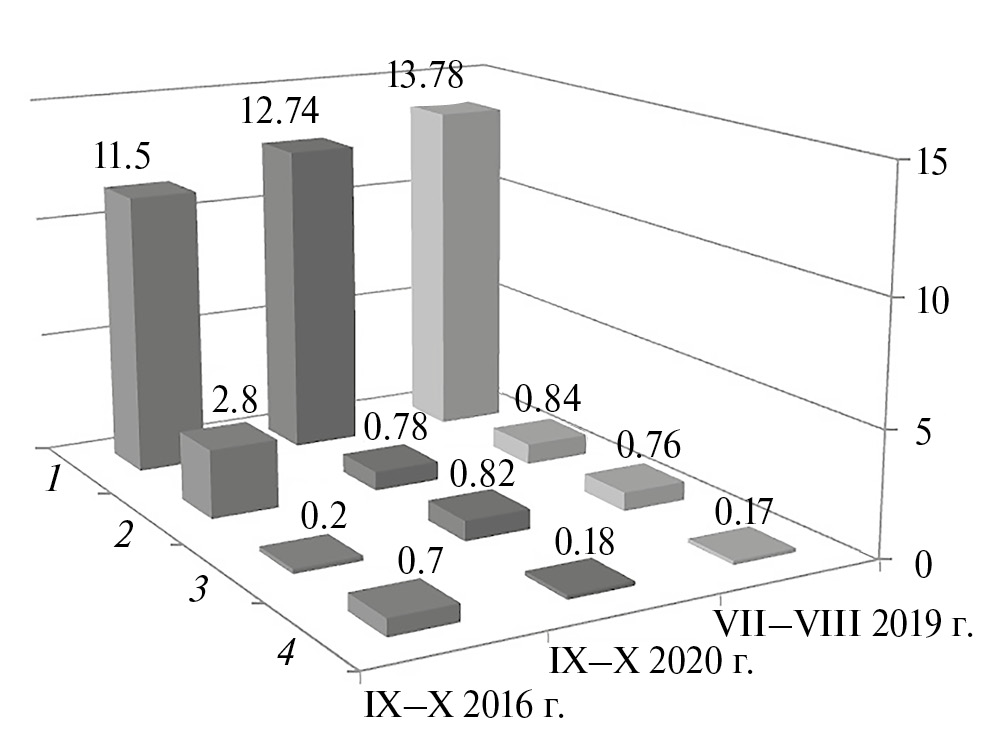 Рис. 5. Индексы разнообразия ихтиопланктона в июле–августе 2019 г. и сентябре–октябре 2016 и 2020 гг. 1 – индекс видового богатства, 2 – видового разнообразия, 3 – доминирования, 4 – выровненности.