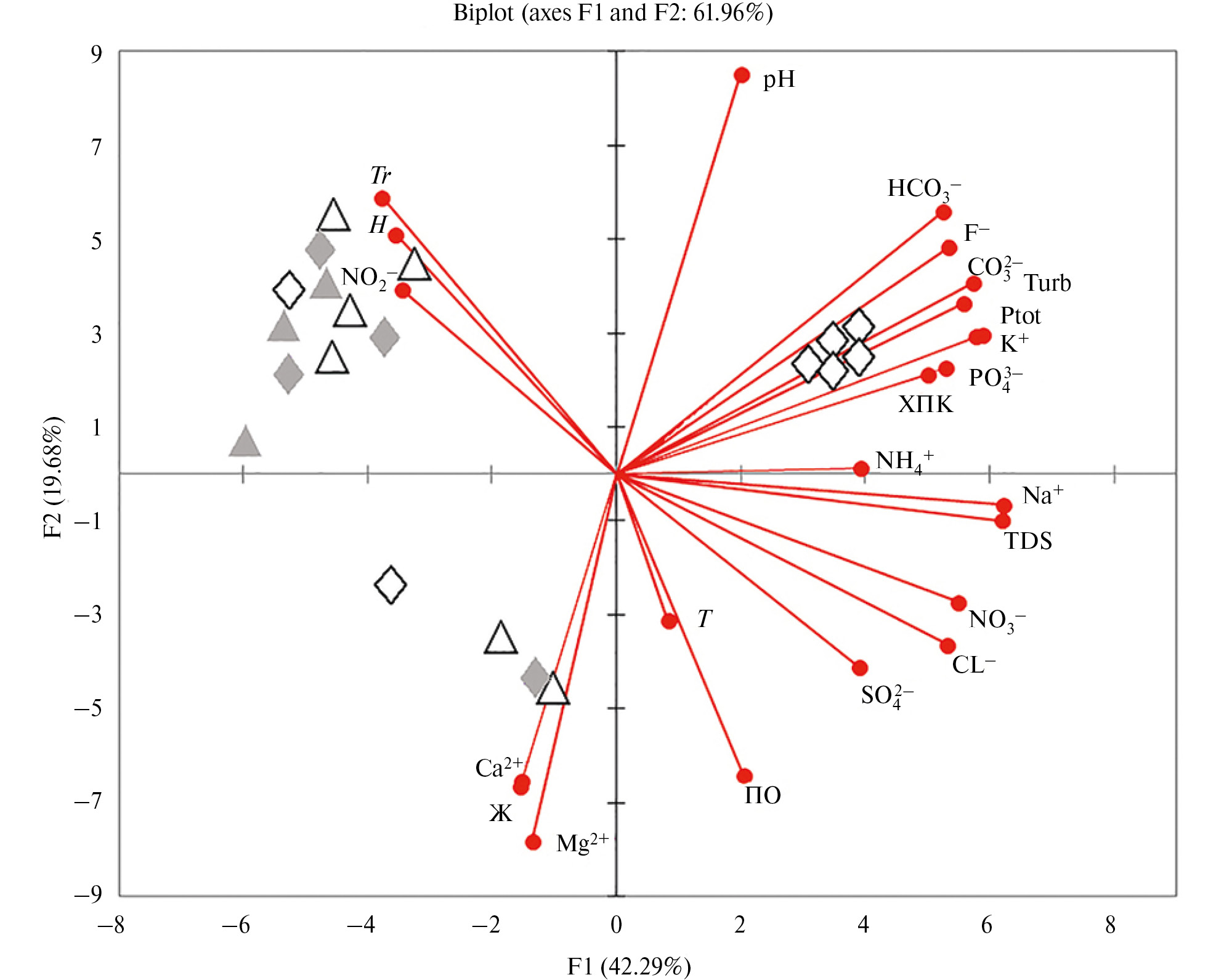 Полученные данные обрабатывали с помощью пакетов компьютерных программ Microsoft Excel 2010 и надстройки для программы Microsoft Excel XLSTAT (Addinsoft, США). Для выявления влияния ведущих факторов, определяющих взаимосвязь биоразнообразия гидробионтов и абиотических параметров среды, использовали факторный анализ методом главных компонент (Principal Component Analis, PCA). Нормирование данных проводили по делению исходных данных на среднеквадратичное отклонение соответствующих переменных (Шипунов и др., 2014). Абсолютное значение нагрузки >0.60 принимали за существенную связь.