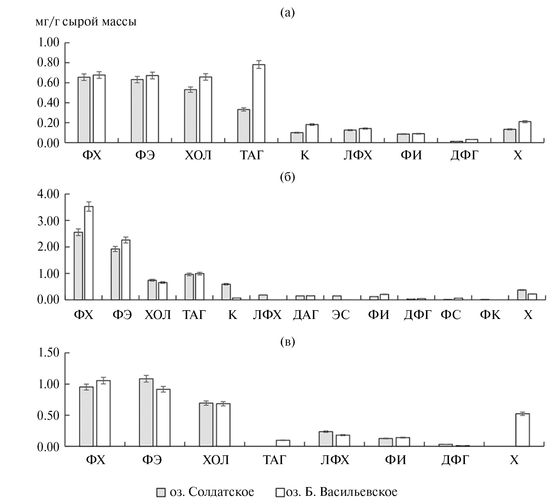 В ноге L. stagnalis из оз. Солдатское из липидов преобладал ФЭ, в оз. Большое Васильевское — ФХ в количестве по 1.1 мг/г сырой массы (рис. 1в). Соотношение ФХ/ФЭ в первом случае было 0.9, во втором — 1.2. Кроме того, в ноге особей из оз. Солдатское содержалось на 33% больше ЛФХ, чем из оз. Большое Васильевское.
