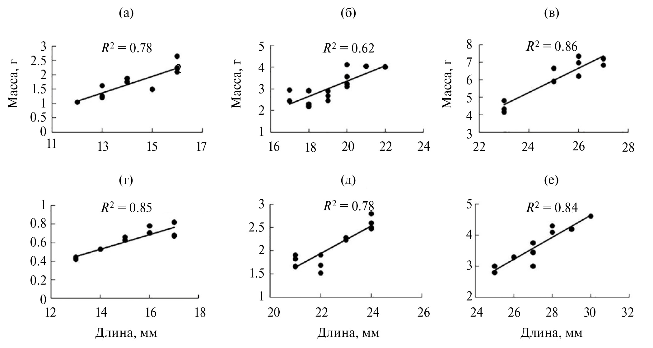 Для понимания особенностей и числовых значений аллометрии роста построены линейные модели регрессии линейно-массовых показателей, масс тканей общей массы моллюска (рис. 2, рис. 3). Для групп I–III сердцевидки (рис. 2а–в) коэффициенты детерминации, показывающие доли дисперсии общей массы, объясняемые созданными регресионными моделями зависимости от длины раковины, R2 = 0.78, R2 = 0.62, R2 = 0.86 были соответственно. В группе I и группе III модель линейной регрессии хорошо соответствует данным, на которых она построена, в 78 и 86% случаев входная переменная (длина моллюска) объясняет вариации массы тела сердцевидки. В группе II показатели — 62% общей массы. Для гребешка (рис. 2г–2е) получены коэффициенты детерминации R2 = 0.85, R2 = 0.78, R2 = 0.84, т.е. во всех группах изменение факторного признака определяет высокую долю изменчивости результативного признака.