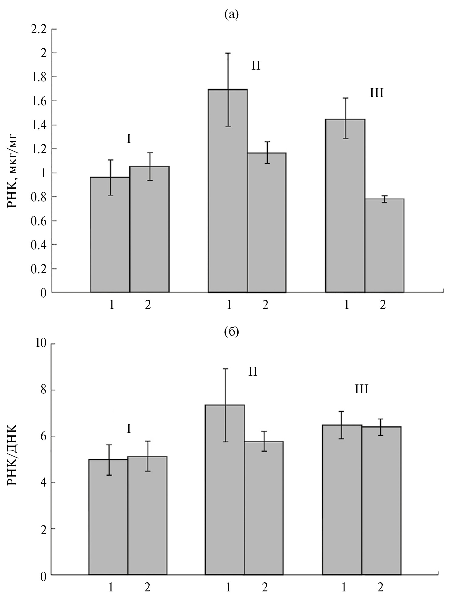 Рис. 4. Среднее для групп содержание суммарных РНК для тканевых гомогенатов (а) и значения индекса РНК/ДНК тканевых гомогенатов (б) особей Cerastoderma glaucum (1) и Flexopecten glaber ponticus (2). Размерные группы церастодермы: I — 12–16 мм, II — 17–22 мм, III — 23–28 мм. Размерные группы гребешка: I — 13–17 мм, II –21–24 мм, III — 25–30 мм. Вертикальными планками обозначены стандартные отклонения (SD).