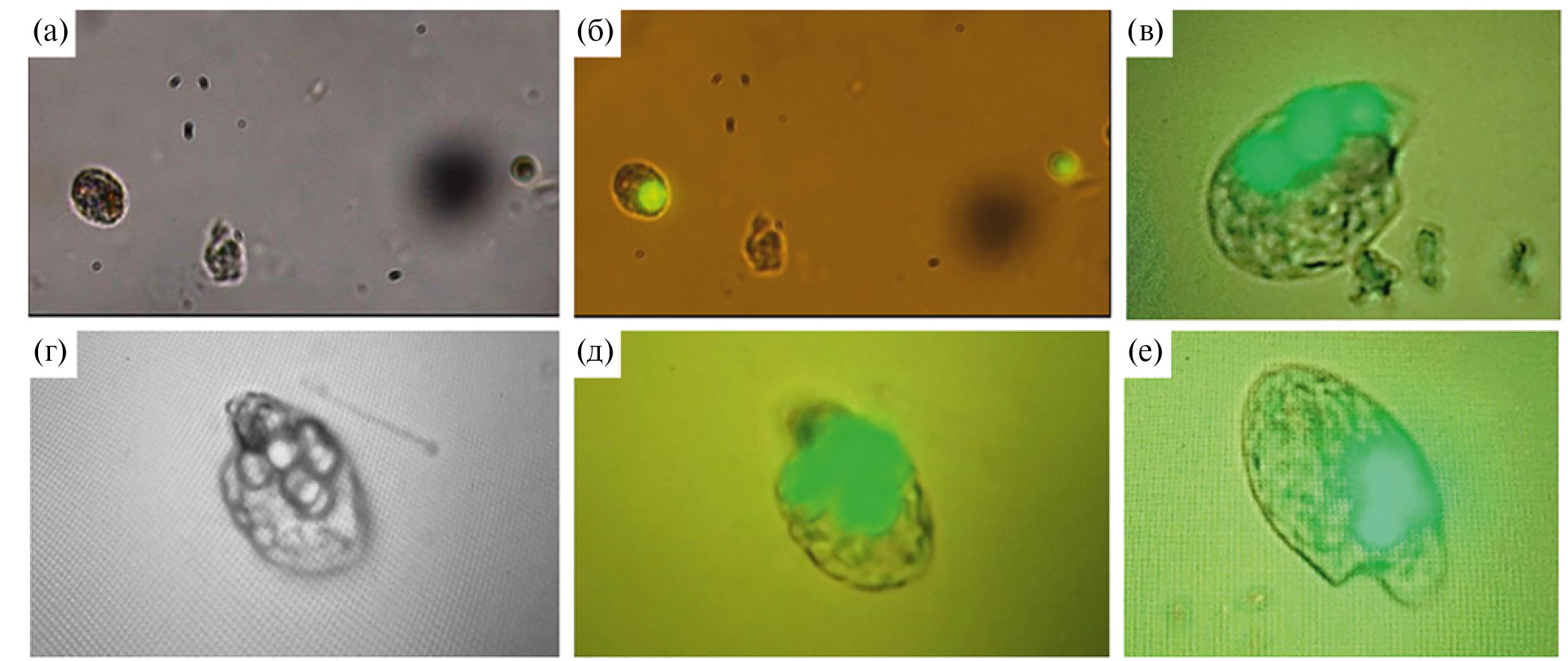 Микроскопия. Микрофотосъемку микросфер и микроорганизмов проводили под микроскопом Nikon Eclipse TS100-F, оборудованным цифровой камерой, в эпифлуоресцентном (набор светофильтров для возбуждения в синей области спектра) и световом режимах. Благодаря ярко-зеленой флуоресценции, MS были хорошо видны в питательной среде и в пищеварительных вакуолях O. marina (рис. 3).