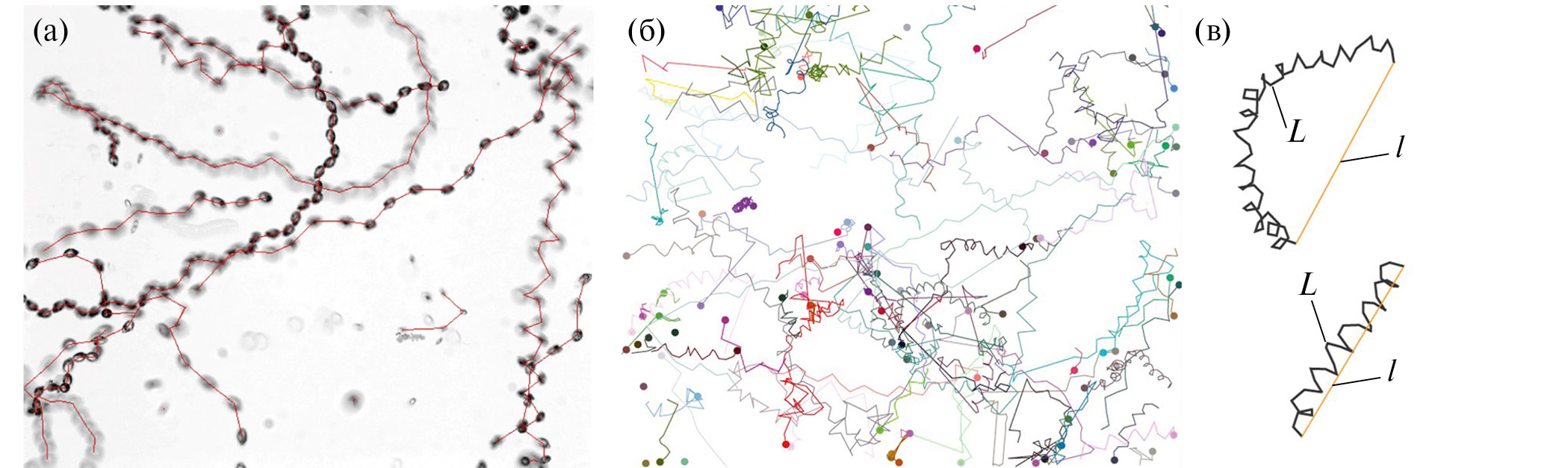 Рис. 4. Трекинг движения динофлагеллят в программе ImageJ (а), набор треков, полученный в одном из экспериментов (б), и схема определения коэффициента спрямленности траектории движения O. marina (в). Обозначения L и l приведены в тексте.
