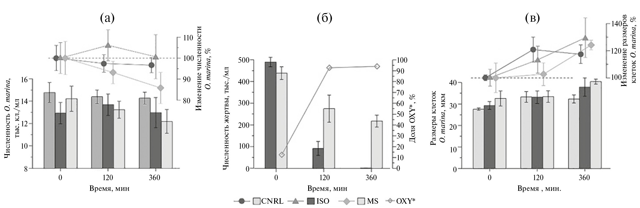 Динамика численности хищника и жертв в ходе эксперимента. Численность клеток O. marina в течение эксперимента во всех сосудах изменялась незначительно (рис. 5а). Наибольшие изменения (15%) – статистической значимости уменьшение численности динофлагеллят с 14.2 ± 1.1 до 12.2 ± 1.1 тыс. кл./мл к концу эксперимента, наблюдали в сосудах с MS, наименьшие (3%) – в контроле (CNRL), где численность снижалась с 14.8 ± 0.9 до 14.3 ± 0.5 тыс. кл./мл (рис. 4а).